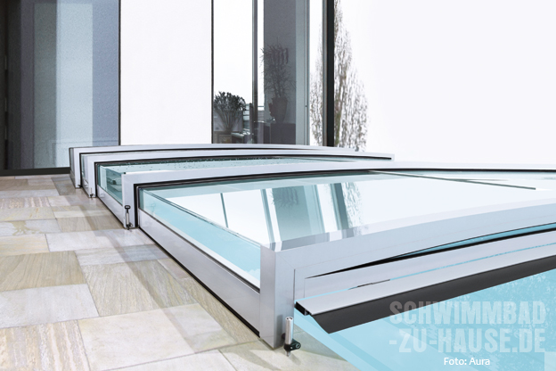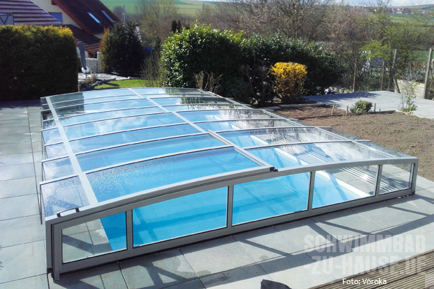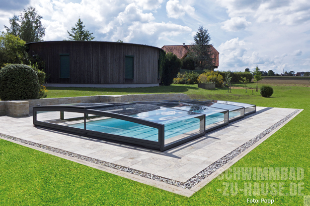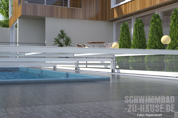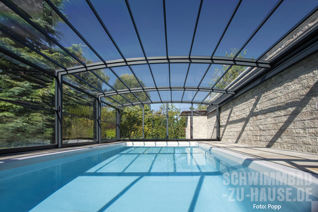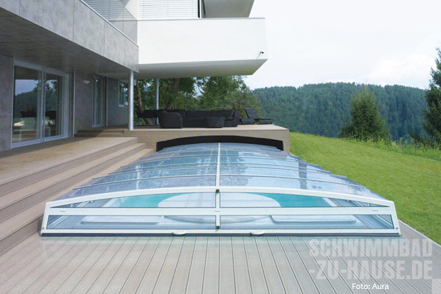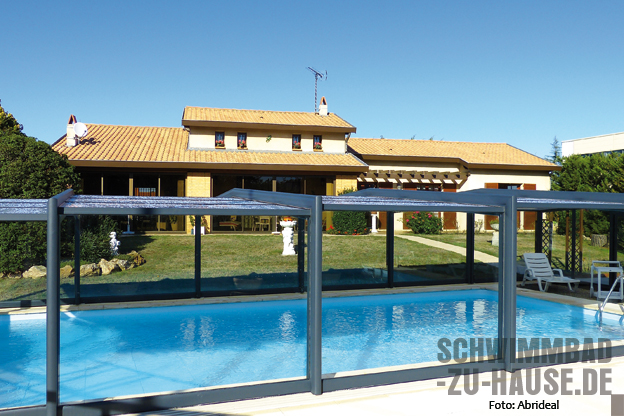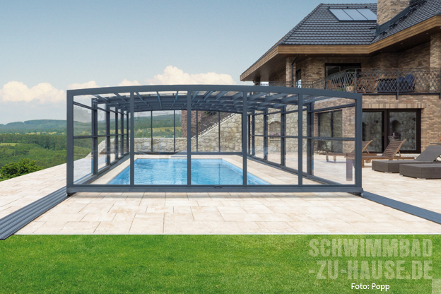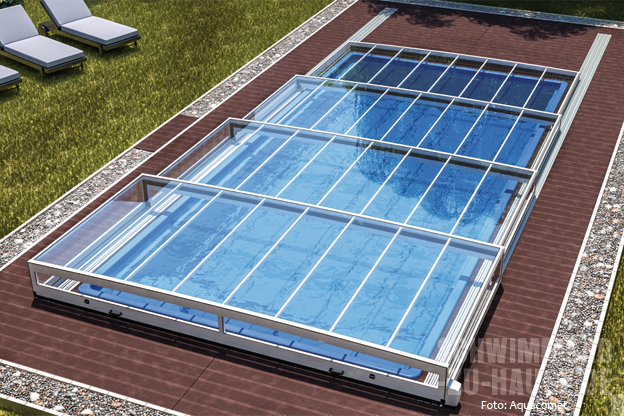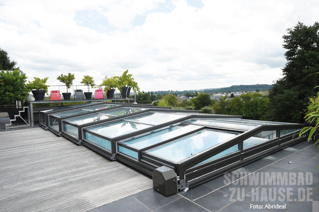 Diese Variante eignet sich bestens für mittlere bis breite Becken. Die niedrige Überdachung „Extenso“ ist aus VSG- Echtglas gefertigt. Öffnung per Motorisierung und Zugang über Schiebetür. Von Abrideal