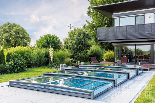 Der superflachen Bauart zu verdanken, schmiegt sich die „Horizont“-Überdachung hervorragend in ihre Umgebung ein und ist eine optimale Ergänzung des Gartenpools. Ihre eckige Formenwelt passt sich dem modernen Baustil an. Hier in der Ausführung mit beidseitiger Schiene. Von Aquacomet