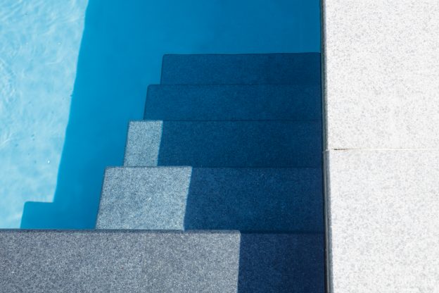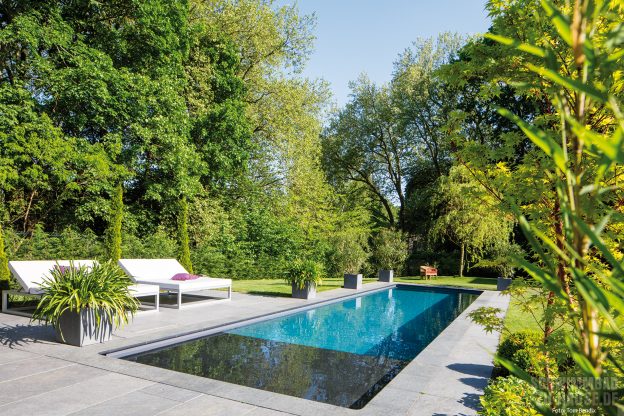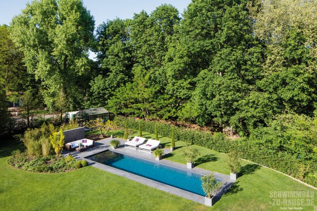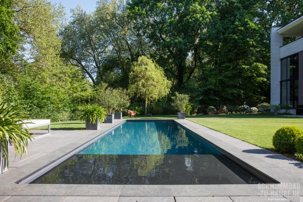 „Der Besitzer hatte sich mit seiner Frau bereits im Vorfeld umfassend informiert und einige Referenzen auf unserer Website angesehen, weshalb er genau wusste, dass sein Pool geradlinig und elegant werden sollte“, erinnert sich Jan Rambow. Natürlich spiegelt die moderne und zeitlose Grundausrichtung auch die Tatsache wider, dass der Bauherr als Geschäftsmann und Globalplayer bereits einige außergewöhnliche Locations mit ganz besonderen Poolanlagen besucht hatte. In diesem Sinne ist das internationale Flair der gesamten Anlage keine Überraschung, denn der Potsdamer Poolbesitzer brachte seine Ideen und Vorstellungen in die Planung mit ein. „Wir waren uns einig, dass wir keinen himmelblauen Pool möchten. Zum Glück hat uns der verantwortliche Poolbauer mit alternativen Lösungen zur Farbgebung sehr gut beraten. Zudem liegt das Grundstück im Bereich des UNESCO-Weltkulturerbes, sodass wir eine Baugenehmigung brauchten. Dabei bekamen wir freundliche Unterstützung vom Denkmalamt“, verrät uns der glückliche Geschäftsmann auf Nachfrage.