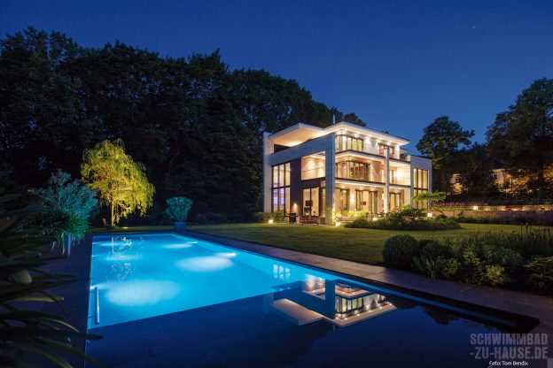 Es ist also nicht nur eine Schönheit der Nacht, sondern ein Trendsetter-Becken, das sicher viele Wellnessprofis begeistern wird, genauso wie den Bauherren, der sein Poolprojekt wie folgt auf den Punkt bringt: „Es ist der perfekte Pool für unsere Ansprüche, mit einer tollen Architektur, die sich ideal in den Garten einfügt. Zudem steht die Farbe des Wassers in kontrastreicher Harmonie mit der Poolumrandung und Terrasse und die Pooltechnik ist ganz bequem über WLAN steuerbar.“
