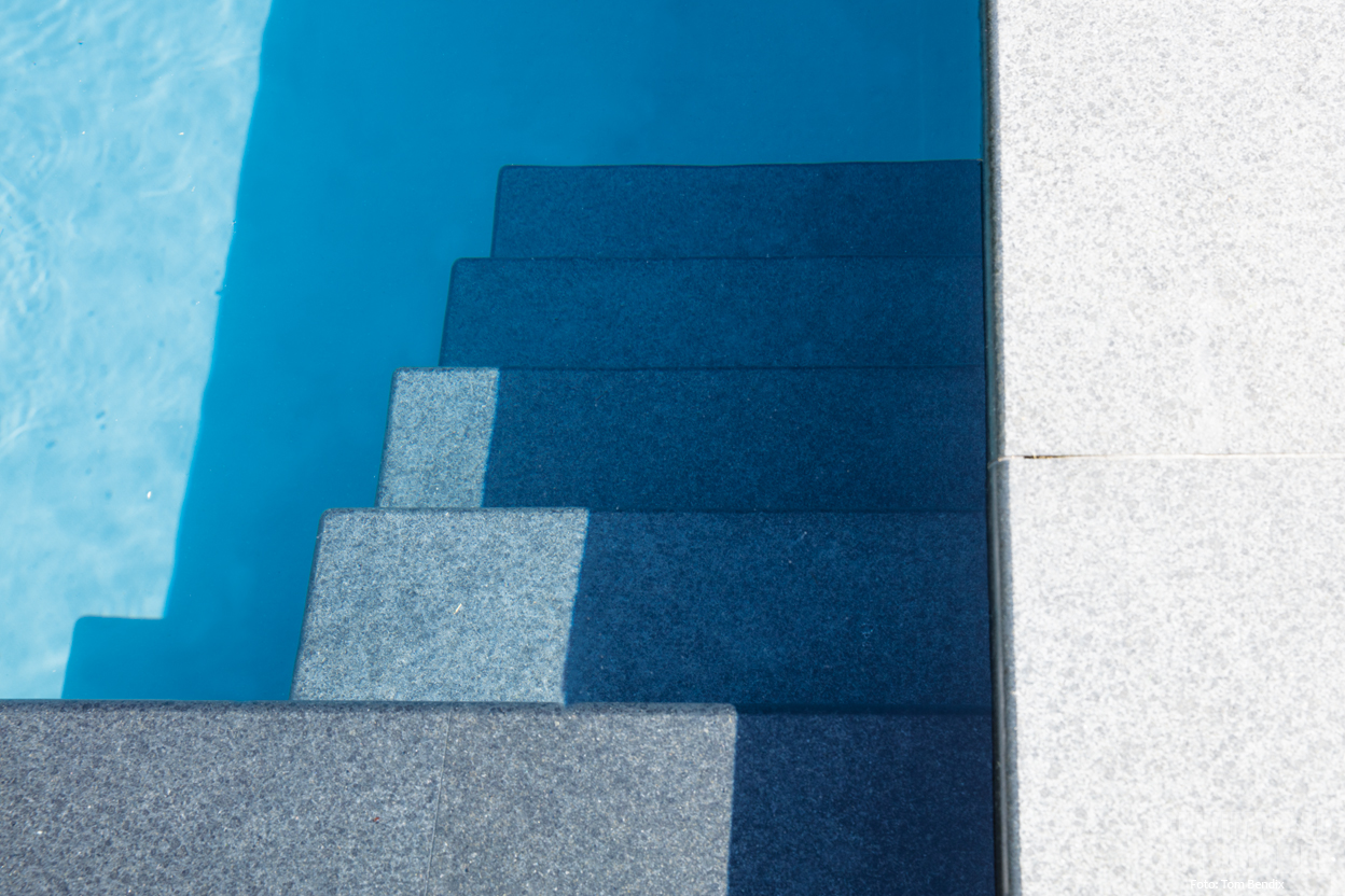 Trotz der präzisen Vorstellungen und Vorgaben war der Bauherr also offen für Vorschläge seitens der Poolprofis. „Es ist immer ein besonderes Glück, wenn man mit einem Bauherren zusammenarbeiten kann, der offen für hochwertiges Design ist und mit dem man im Dialog herausragende Lösungen erarbeiten kann“, verrät uns auf Nachfrage der Geschäftsführer von Schwimmbecken-Rambow. In einem solchen kreativen Prozess entstand beispielweise die Umsetzung der Bachlounge sowie die Festlegung des Fugenbildes im Beckenumfeld. Auch die Idee der Poolprofis, den Pool ganzjährig zu betreiben, fand Gehör. So bleibt der Pool im Winter durch eine Frostschutzschaltung eisfrei und wird damit zu einem exklusiven Dekoelement mit schönen Spiegeleffekten auf der Wasseroberfläche. Im Sommer verwandelt er sich in einen tiefblauen Ruhepol, der für sportliches Schwimmen aber auch chilliges Relaxen bereitsteht.
