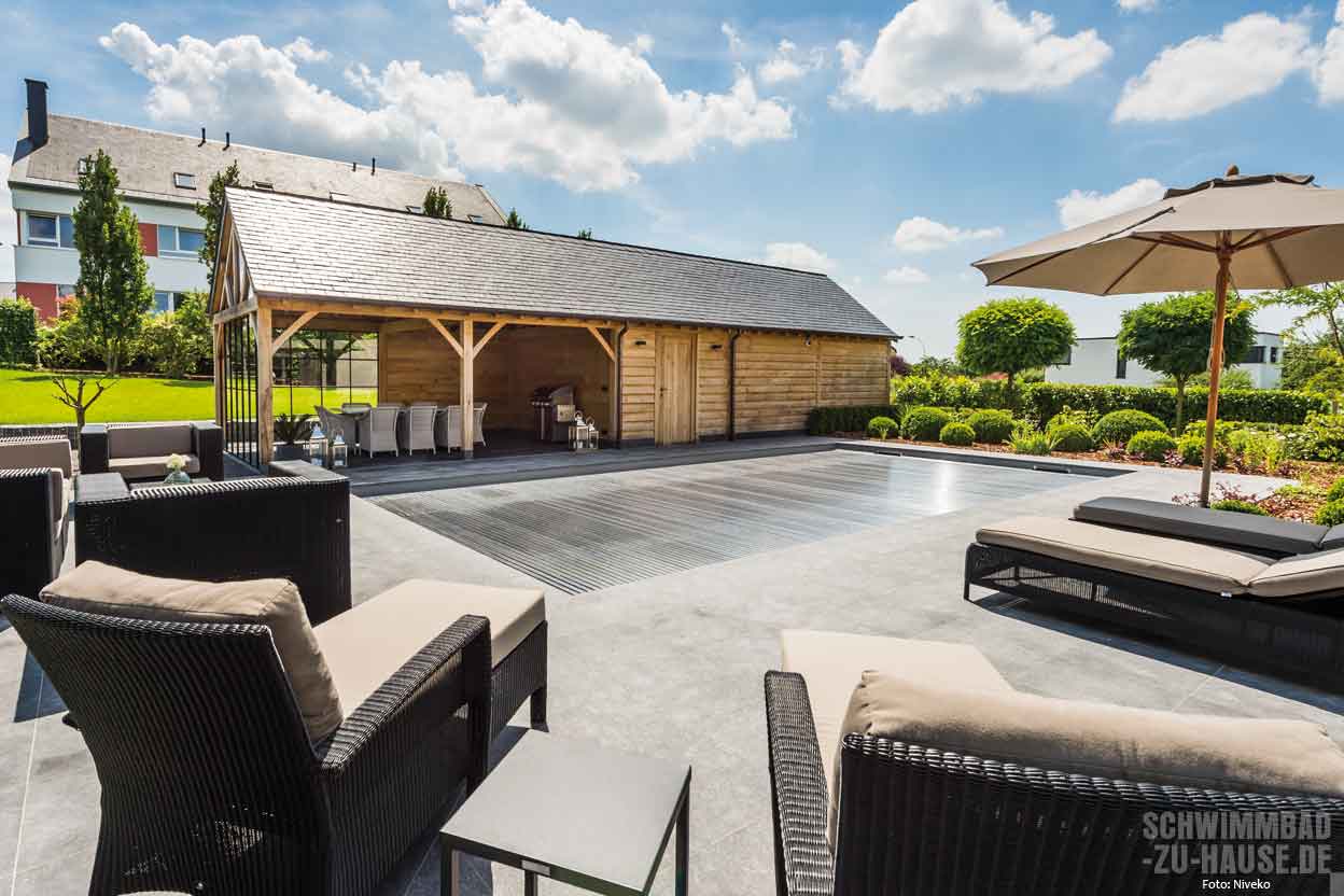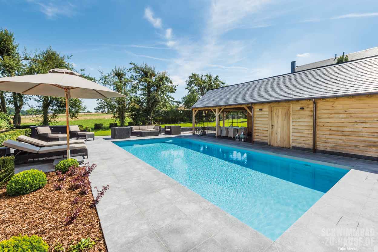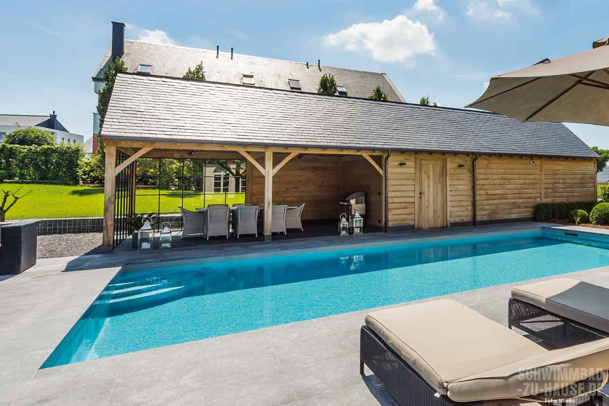 Wer ein großes Gartengrundstück hinter dem Wohnhaus hat, dem stehen in puncto Gestaltung nahezu alle Türen offen. Schon lange überlegten die Bauherren dieses Anwesens in Luxemburg, ihren Garten in eine private Wellnesslandschaft zu verwandeln. Fest stand, dass ein geradliniges Schwimmbecken hierbei das klare Zentrum bilden sollte. Sitzgelegenheiten, Terrasse und ein Gartenhaus, unter dessen Dach man mit der Familie grillen kann, sollten sich um das Badeparadies herum positionieren. Mit diesen Vorstellungen im Gepäck konfrontierten sie Herrn Back von der Firma Aquadeluxe, der mit der Planung sowie Umsetzung des Poolprojekts beauftragt worden war. Als erfahrener Fachmann ging er bis ins kleinste Detail auf die Wünsche der Bauherren ein. „Da vor allen Dingen die optisch harmonische Verbindung zwischen Becken, Garten und Haus im Vordergrund stand, kam der Wahl der Beckens größte Aufmerksamkeit zu“, verrät er im Gespräch mit haus+wellness*.