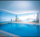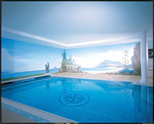 Die Malerei umfasste die Landschaft im Schwimmbad mit ca.50 qm, eine gegenüberliegende 60 qm-Wand aus (vor Ort) gemalten Steinplatten, sowie eine „antik“ gemalte Wand im darüberliegenden Wintergarten.
