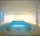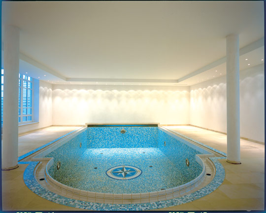 Eine besondere Hersauforderung bestand in einem Wanddurchbruch, in dem sich die zusammengerollte Poolabdeckung befand. „Wir haben dieses recht unschöne Loch in der Wand insofern als glaubhaftes Objekt in die Malerei mit einbezogen, als wir daraus ein Wasserbecken mit Pflanzen und zwei wasserspeienden Greifen gemacht haben“ beschreibt Claus Biswanger eine der kreativen Lösungen, die ihn zwischenzeitlich in der Schwimmbadbranche so berühmt gemacht haben. Der Pool selbst wurde mit feinstem Bisazza-Mosaik ausgelegt. Um das Becken schmeicheln naturraue Sollnhofer Steinplatten den Füßen und den Augen gleichermaßen.