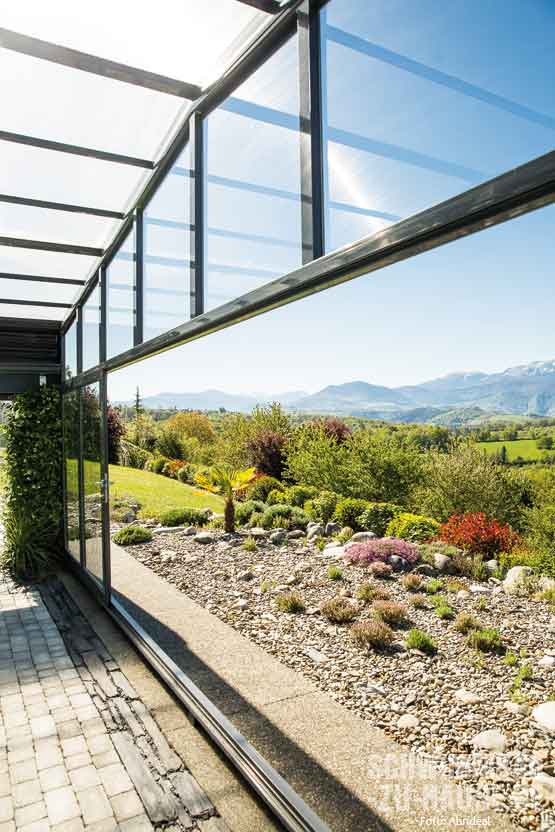 Charakteristisch nach außen gewölbte Wände geben der Schiebe-Überdachung „Omega“ von Alukov ihren Namen. Bequemes Bewegen ist durch diesen Aufbau besonders leicht. Optisches Highlight: Das Dach erscheint niedriger als es tatsächlich ist und entlang der Wände ist der Durchgang überall gewährleistet.