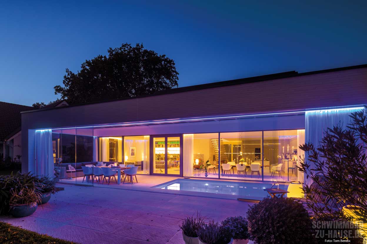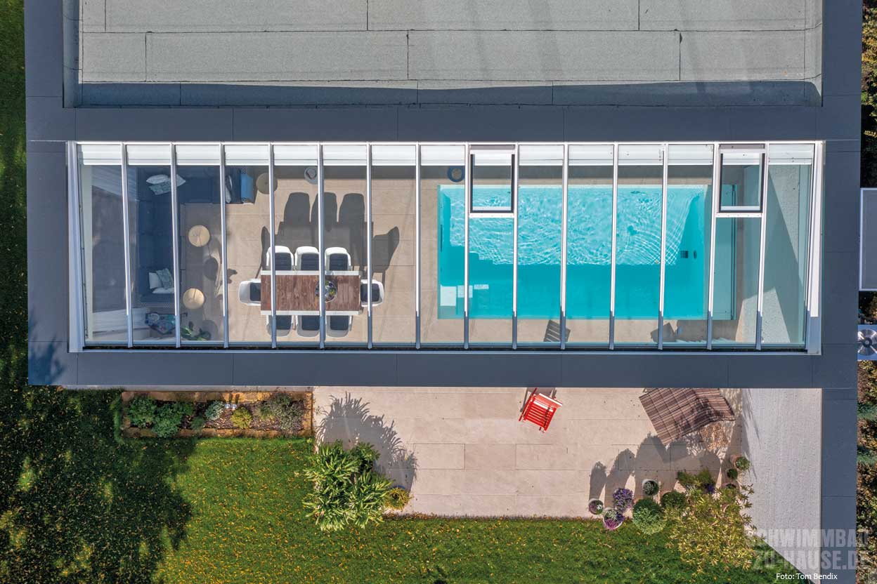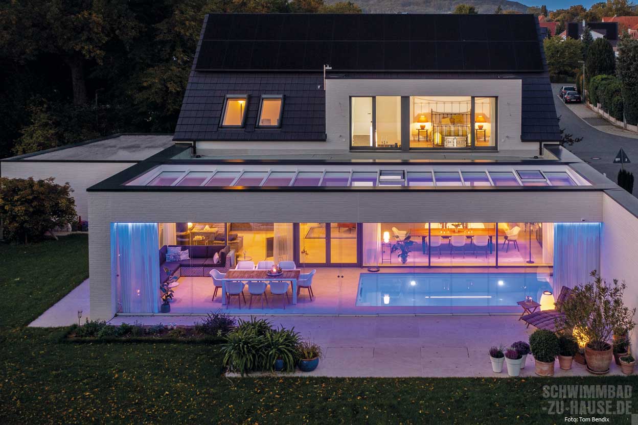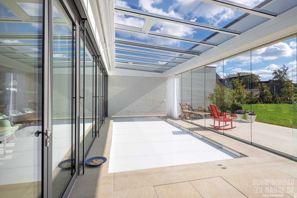 Ein sogenannter Sommergarten schützt das beheizte Schwimmbad vor Wind und Wetter. Dank der großen Glasfront bildet er einen Zwischenraum, der die Vorzüge von Haus und Outdoor-Bereich vereint. Die Sonne wärmt auch bei herbstlichen und frühlingshaften Temperaturen die Terrasse hinter den Glasscheiben auf. So können die Besitzer in ihrem privaten Home-Spa den Sommer verlängern. Bei heißem Wetter lassen sich die Glasscheiben zurückschieben, während eine Markise vor der direkten Sonneneinstrahlung schützt. Im Winter hingegen wärmt das warme Wasser, das mithilfe einer effizienten Wärmepumpe mit Invertertechnologie beheizt wird. So bleiben extreme Witterungsbedingungen draußen: Somit ergibt sich ein Draußen-Gefühl in einem geschützten Bereich.