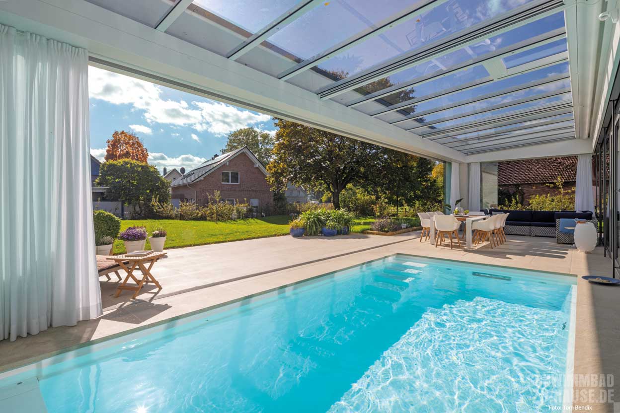 Wertvolle Anregungen für ihr Projekt holten sich die Bauherren auf der über 2.000 Quadratmeter großen Ausstellung des Schwimmbadbauers Löchte. „Der Pool sollte ganzjährig nutzbar und trotzdem mit dem Garten in einer starken freien Sichtbeziehung stehen“, erklären die beiden ihre ursprüngliche Idee. Eine