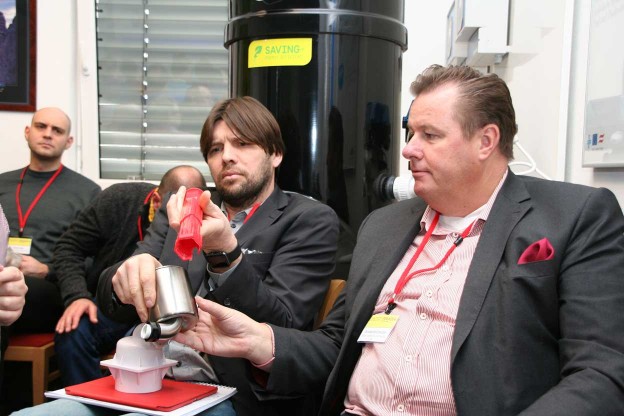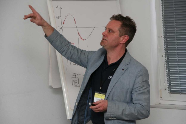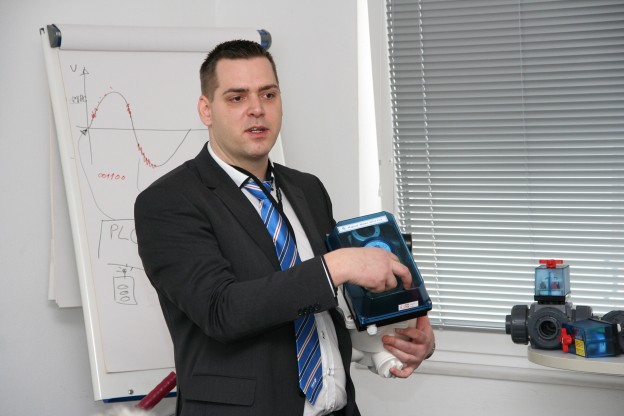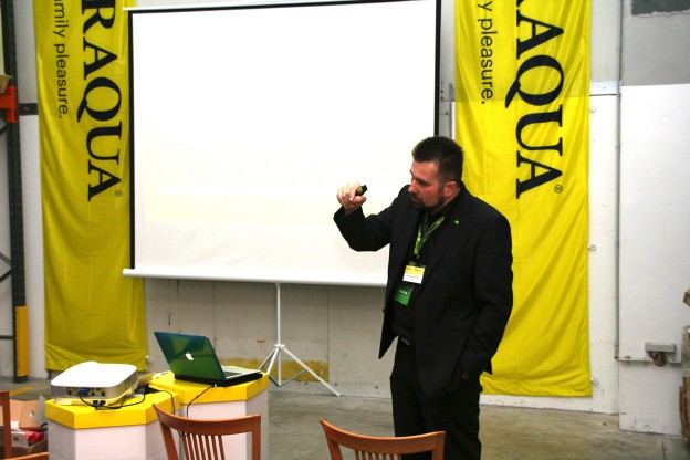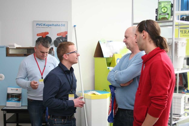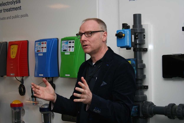 Los ging es mit dem komplexen Thema der Salzelektrolyse. Referent Enrico Kern von Peraqua schaffte es in einem kurzweiligen Vortrag zum Thema „Neolyse und UV Technologie für das private Schwimmbad“ die Zusammenhänge der elektrochemischen Wasseraufbereitung am Beispiel der Produkte von Idegis verständlich darzustellen und ging im Anschluss daran auf Nachfragen des Publikums ein. Immer wieder fing auch Wolfgang Irndorfer die Stimmung unter den Gästen ein, in dem er um praxisbezogene Feedbacks zu den Vortragsschwerpunkten bat.