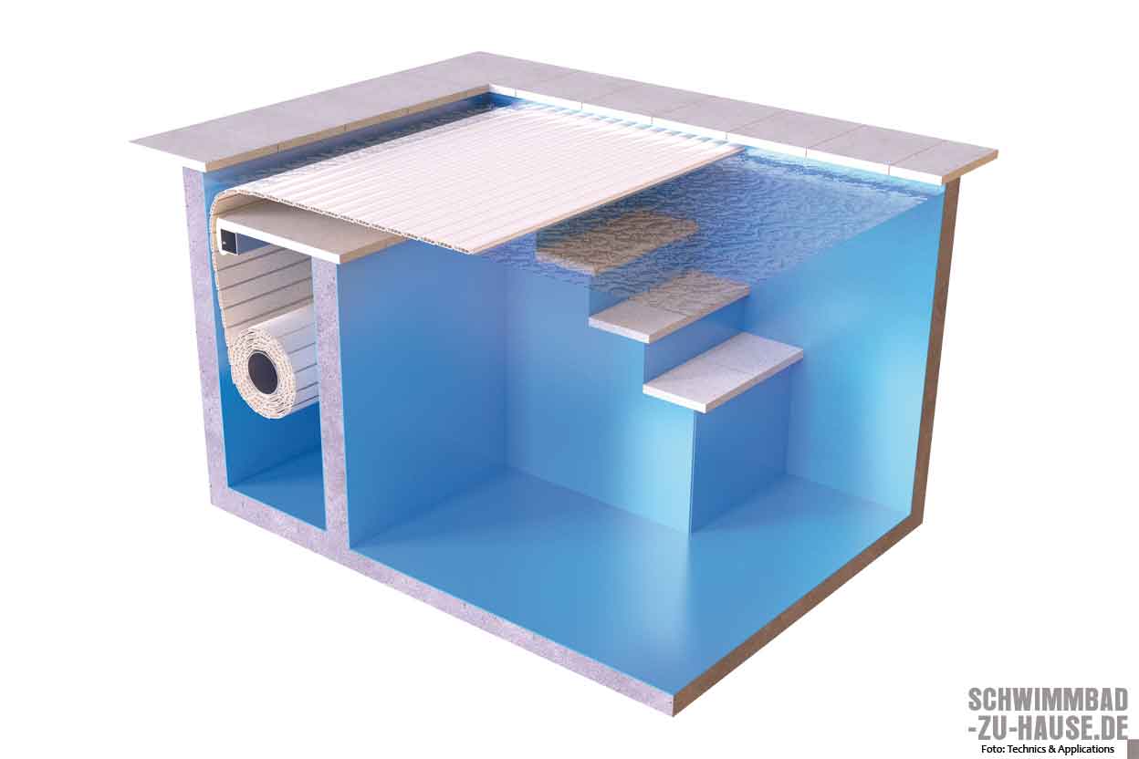 Eine Abdeckung fürs Schwimmbad mittels Rollladen ist sowohl für Außen- als auch für Innenpools eine lohnende Anschaffung. So entsteht bei einem Außen-Schwimmbad etwa der größte Wärmeverlust durch die Wasserverdunstung. Eine strombetriebene Wärmepumpe muss das Wasser immer wieder aufs Neue erhitzen. Für den Wärmeverlust des Wassers sind mehrere Faktoren verantwortlich, von denen der ausschlaggebende die Verdunstungsenthalpie ist. Das heißt, der an der Wasseroberfläche stattfindende Verdunstungsprozess entzieht dem Wasser Energie. Bei Outdoor-Pools ist dieser Effekt am stärksten, da hier die bereits mit Wasser gesättigte Luft direkt über der Wasseroberfläche regelmäßig durch Luftbewegungen verweht wird. Dieser Umstand verhindert die Herausbildung einer natürlichen Dampfsperre. In einem abgedeckten Schwimmbecken bildet das Cover eine optimale Sperre, die die warme Luft im Becken hält. Somit kühlt das Wasser nicht so stark ab, die Verdunstung wird erheblich reduziert und der Wasserverbrauch sinkt. Zudem kann man den Einsatz der Wärmepumpe und somit die Stromkosten begrenzen. Durch höhere Wassertemperaturen – auch in der Nebensaison – ist damit eine längere Badesaison mit dem Einsatz von Rollladenabdeckungen möglich. Einen zusätzlichen Spareffekt erzielt man dadurch, dass Rollläden dabei helfen, die Wasserqualität auf einem hohen Niveau zu halten und damit die Kosten für den Einsatz von Chemikalien verringern. Dies geschieht zum einen dadurch, dass Cover den Lichteinfall auf das Wasser verringern und so das Algenwachstum stark einschränken. Zum anderen wird durch die signifikant reduzierte Verdunstung der Abbau von Chlorpräparaten deutlich verlangsamt. Zusätzlich schützen Rollladen das Wasser vor Grobverschmutzungen. Laub und Schmutz kann dann entweder mit einem Gartenschlauch von der Pooldecke entfernt werden oder beim Aufwickeln des Covers direkt vor den Skimmer und damit in die Filteranlage transportiert werden.