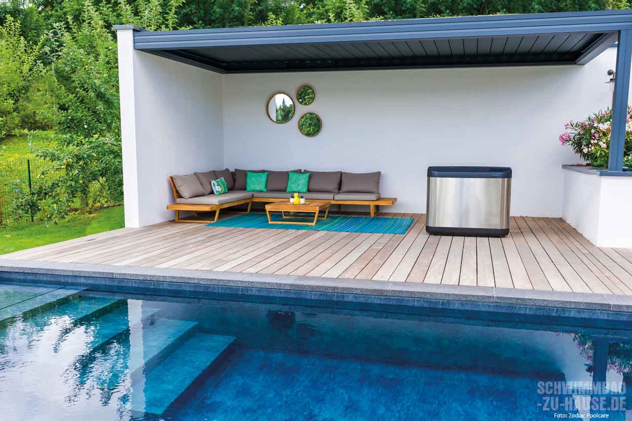 Um auch in dieser Zeit ein Freibad nutzen zu können, setzen viele Besitzer eines Outdoorpools auf die Beheizung mit einer wetterunabhängigen Luft-Wasser-Wärmepumpe. Denn die größte natürliche Energiequelle ist die uns umgebende Luft. Mit dem Einsatz einer Wärmepumpe wird die Nutzungszeit eines Freibades beispielsweise vom zeitigen Frühjahr bis in den Spätherbst hinein verlängert. Übrigens: Wärmepumpen können auch im Innenbereich zum Einsatz kommen. Da Wärmepumpen bei geringem Energieeinsatz keinerlei Emissionen verursachen, handelt es sich hierbei um eine überaus umweltfreundliche Variante der Poolheizung. Die einfache und kostengünstige Installation sind weitere Vorteile dieser Anwendung. Absolutes Plus im Kontext der aktuellen Debatte um Einsparungen von Energiekosten: Eine Wärmepumpe kann in den meisten Fällen ganz einfach nachgerüstet werden – und stellt somit eine echte Alternative zur klassischen Heizung dar!