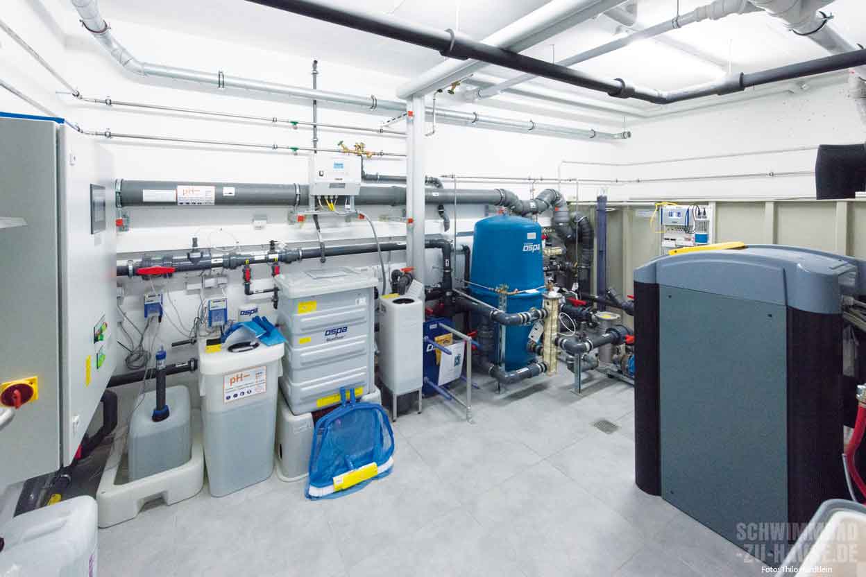 Doch nicht nur die Optik spielte eine Rolle, viel Wert wurde auch auf hochwertige Technik gelegt, die Betriebskosten und Wartungsaufwand reduziert: Die „Ospa-Blue-Clear“-Anlage arbeitet vollautomatisch und desinfiziert das Schwimmbadwasser auf der Basis von Kochsalz; die Beheizung erfolgt über die Haus-Wärmepumpe, die ihren Strom von der Photovoltaikanlage auf dem Dach bezieht, und der Solarrolladen zur