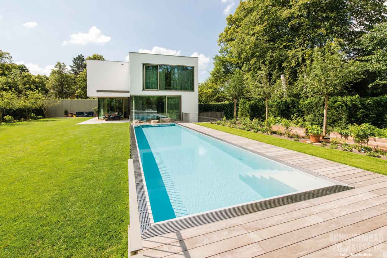 Wer sich den Traum von einem Swimmingpool im eigenen Garten erfüllt, hat meist klare Vorstellungen, wie er ihn nutzen möchte: als Wellnessoase und Rückzugsort, für Badespaß mit Familie und Freunden oder zum sportlichen Schwimmen. Letzteres war die Prämisse beim Bau dieses imposanten Outdoor-Pools. Seine stattliche Länge von 12,50 Meter bietet jede Menge Platz, um kraftvoll Bahnen zu ziehen, und das schnörkellose Design passt perfekt zum Bauhausstil des Wohnhauses.