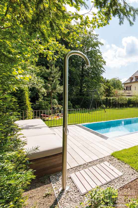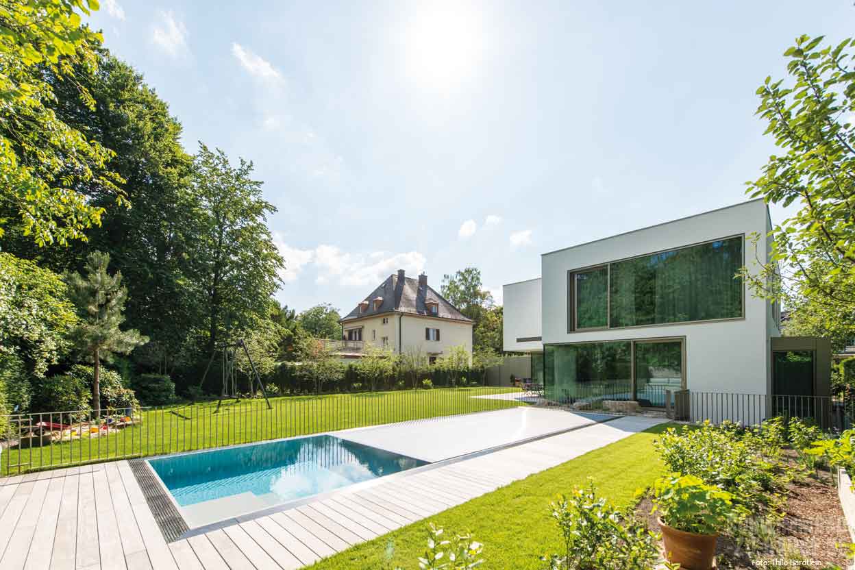 Dank guter Planung im Vorfeld gab es beim Bau keinerlei Hürden. „Das Zusammenspiel aller Beteiligten – Bauherren, Architekt und Handwerker – hat bestens funktioniert“, freut sich Franz Steinbauer über ein gelungenes Projekt, das nicht nur aufgrund seiner konsequenten Geradlinigkeit beispielgebend ist für aktuelle Trends: „Ist ein ausreichend großes Grundstück vorhanden, dann wollen die Kunden auch Bahnen schwimmen und deshalb ein möglichst großes Becken.“