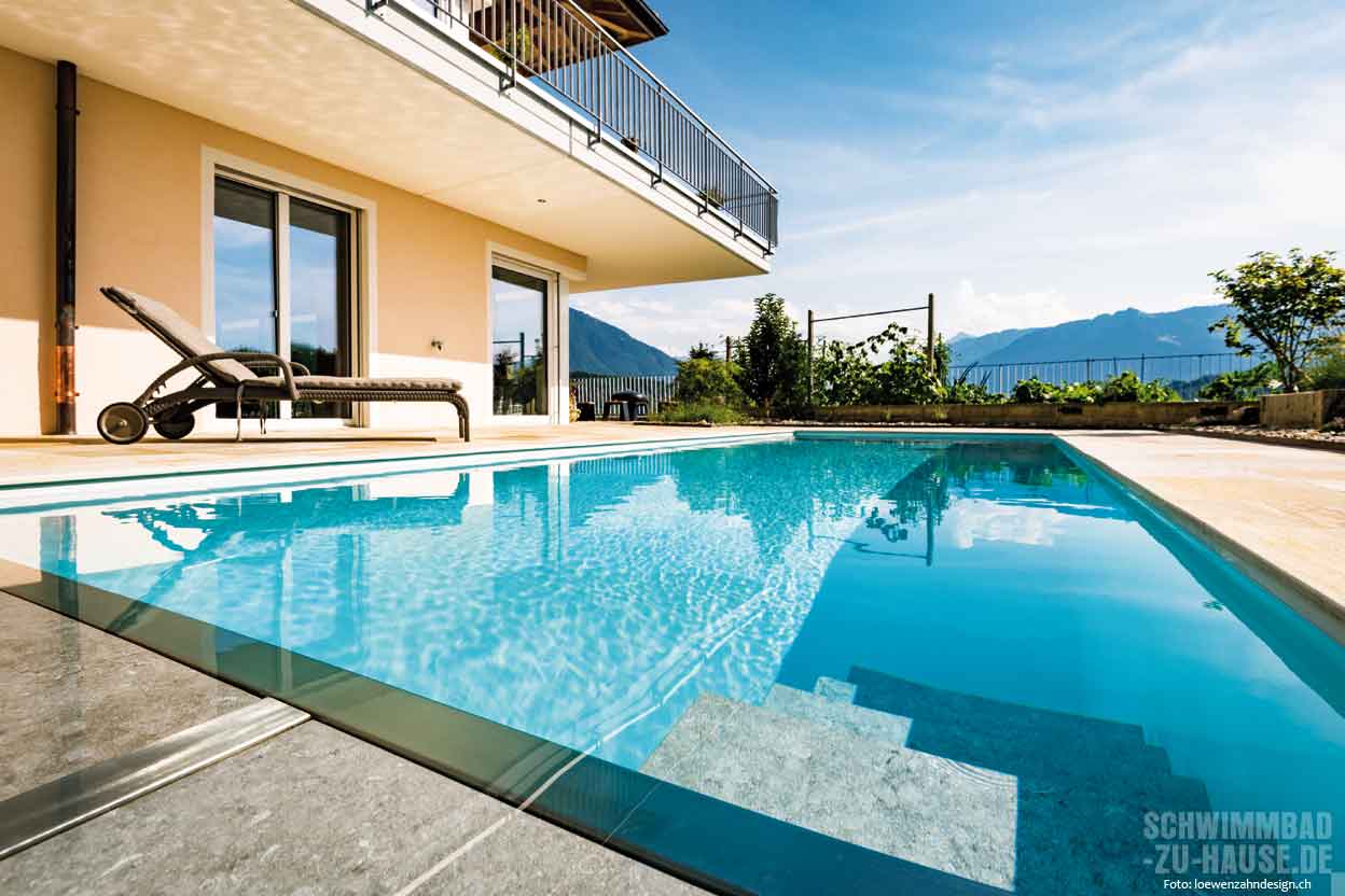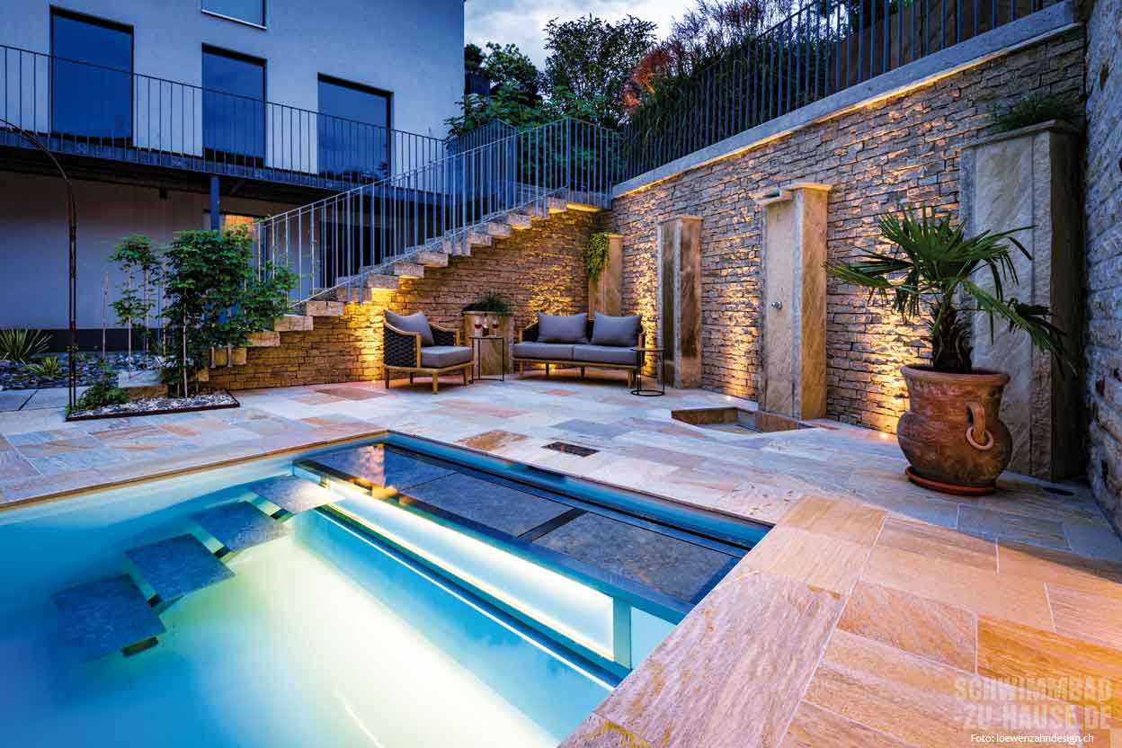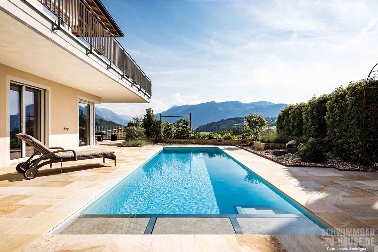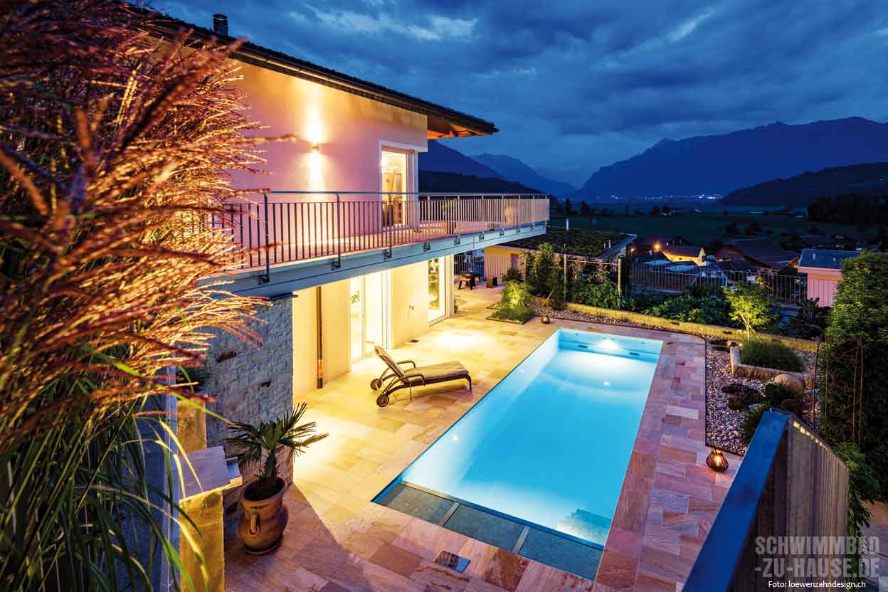 Das Herzstück im neuen Wellnessgarten bildet ohne Frage das formschöne und qualitativ besonders hochwertige Becken „Loft 2.8 S“ aus Glasfaserverbundkunststoff des österreichischen Herstellers Leidenfrost. Mit seinen Maßen 8,80 x 3,20 x 1,44 Meter und der Beckenfarbe „Papyrus“ fügt es sich harmonisch in die Umgebung ein. Bei der Positionierung achteten Bauherren und Fachleute darauf, dass man vom Becken aus den Ausblick in die Berge genießen kann. Ein absolutes Highlight der Wellnessanlage ist ohne Frage der hohe Wasserstand: Dank einer extrem hohen Wasserlinie von nur drei Zentimeter entsteht beim Schwimmen das Gefühl, als befände man sich in einem Überlaufbecken. Ebenso ästhetisch anspruchsvoll: Die Kombination aus edler Ambientebeleuchtung an der Stirnseite unter der Flachwasserzone des Beckens und leuchtstarkem LED-Unterwasserscheinwerfer verleiht dem Becken am Abend und bei Dämmerung eine sinnliche Note. Am Tag kann die Flachwasserzone mit neun Zentimeter hohem Wasserstand von Sonnenanbetern natürlich zum ausgiebigen Relaxen genutzt werden. Unter ihr befindet sich Platz für die integrierte Unterflurrollladenabdeckung. An derselben Seite führt eine mit Feinsteinzeug ausgekleidete Treppe die Bauherren sicher und bequem ins kühle Nass.