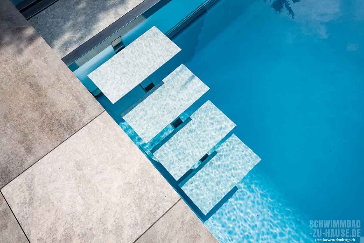 Auch technisch handelt sich bei diesem Projekt um einen Traumpool. Dank eines speziellen Modulschachtsystems konnte die hochwertige Pooltechnik sofort installiert werden. Hierbei ist die Einstiegsleiter in den Schacht bereits werkseitig vormontiert. Der Einstiegsdeckel wird passend zur Poolumrandung gewählt und bauseits installiert. Chapeau!