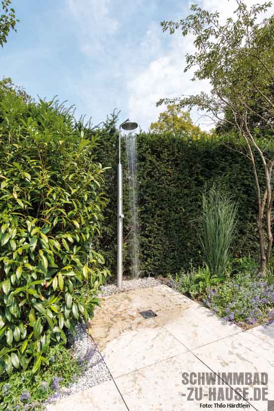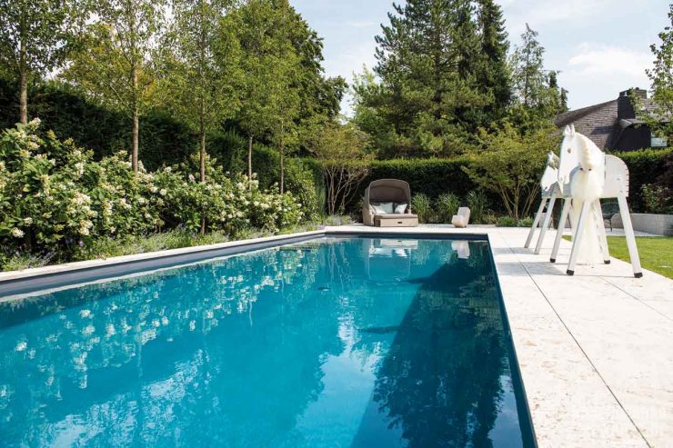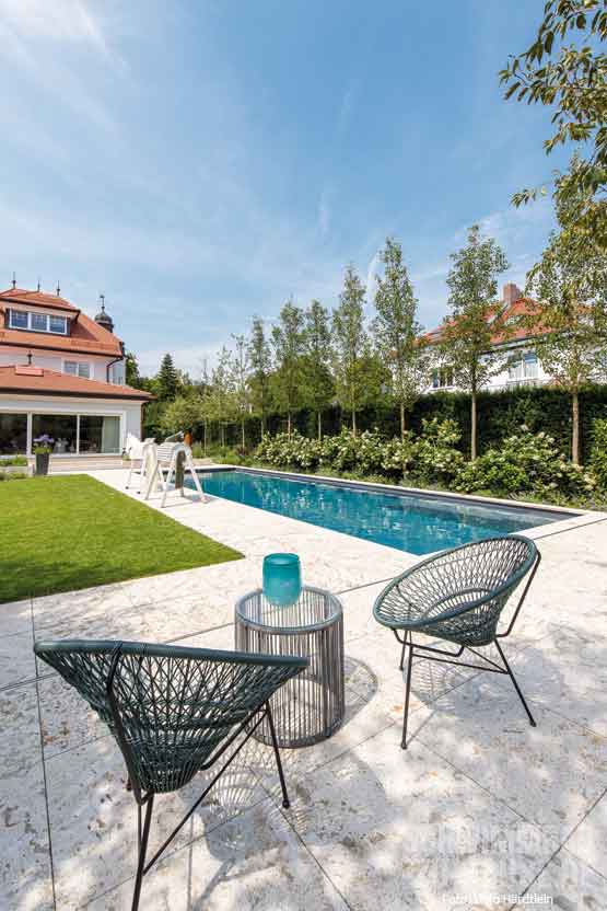 Mit seinen stattlichen Maßen 15,00 x 4,50 Meter fügt sich das mit Schwimmbadfolie ausgekleidete Betonbecken ideal in die vorgesehene Stelle am Rand des Gartens hinter dem Haus ein. Dank einer geradlinigen Formensprache, die bis zu der Poolumrandung in großformatigen Natursteinfliesen stringent beibehalten wird, bilden Umgebung und Pool ein harmonisches Gesamtbild. Um darüber hinaus eine natürliche Wasserfarbe hervorzurufen, entschieden sich Oliver Wilkens und die Bauherren für eine eher dunkle Folienfarbe. Der Effekt: Im Kontrast zur hellen Poolumrandung wird das Wasser besonders ästhetisch betont. Apropos Ästhetik: Wenn die Dämmerung einsetzt, sorgen LED-Unterwasserscheinwerfer für ein stimmungsvolles Ambiente.