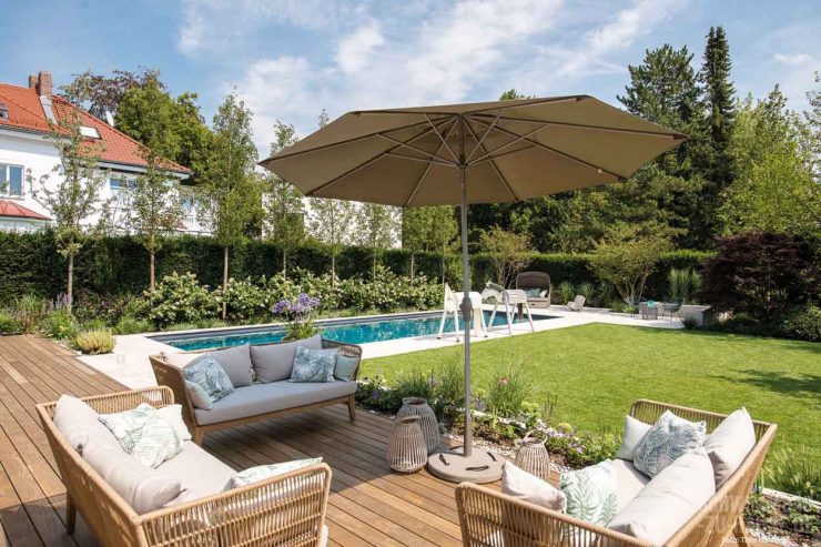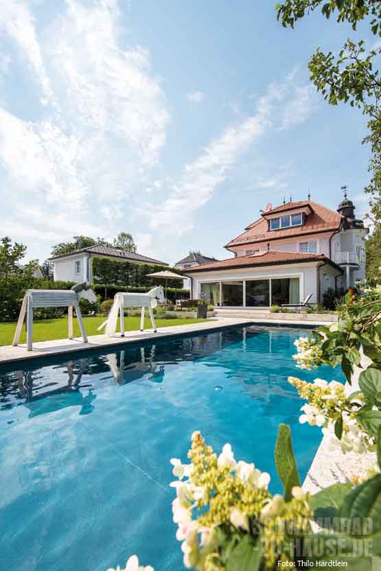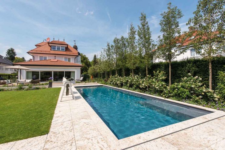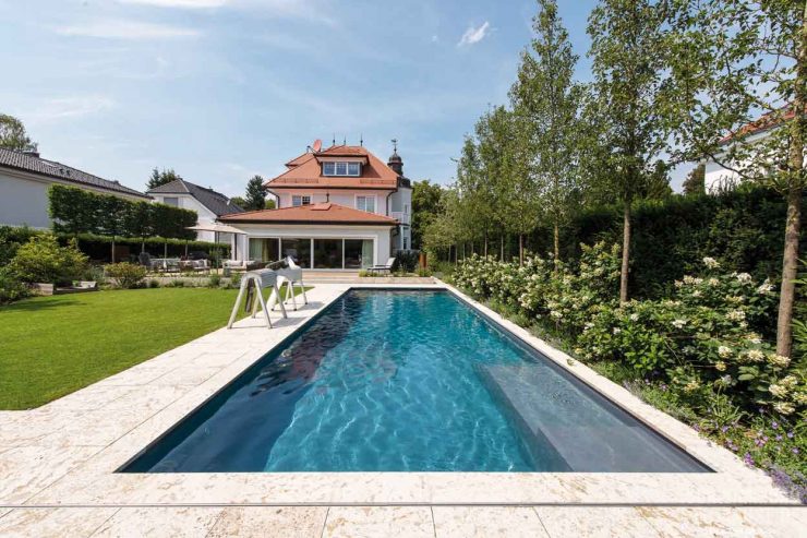 Erwirbt man ein Anwesen, das bereits über ein Freibad im Garten verfügt, so hat man quasi zwei Fliegen mit einer Klappe geschlagen. Sollte man meinen … Doch häufig entspricht der Geschmack der vorherigen Besitzer nicht ganz den eigenen optischen und qualitativen Vorlieben. Ganz ähnlich erging es diesen Bauherren in der Nähe von München. Im Garten des neu erworbenen Hauses befand sich ein Freiformbecken, das starke Ähnlichkeit mit einem Eisbärenbecken im Zoo aufwies. Schnell stand daher fest: Der gesamte Garten und auch der Pool sollten ein Upgrade erhalten. Statt des alten Beckens wünschten sich die Bauherren einen etwas kleineren Pool, der sich moderner und geradliniger präsentieren und somit zum gesamten Gartenkonzept passen sollte. Spaß für die gesamte Familie war das übergeordnete Ziel: Spiele für die Kinder, Entspannung und Abschalten vom Alltag und Wohlfühlambiente durch farbige Poolbeleuchtung – einfach ein Stückchen Urlaub in den eigenen Garten holen!