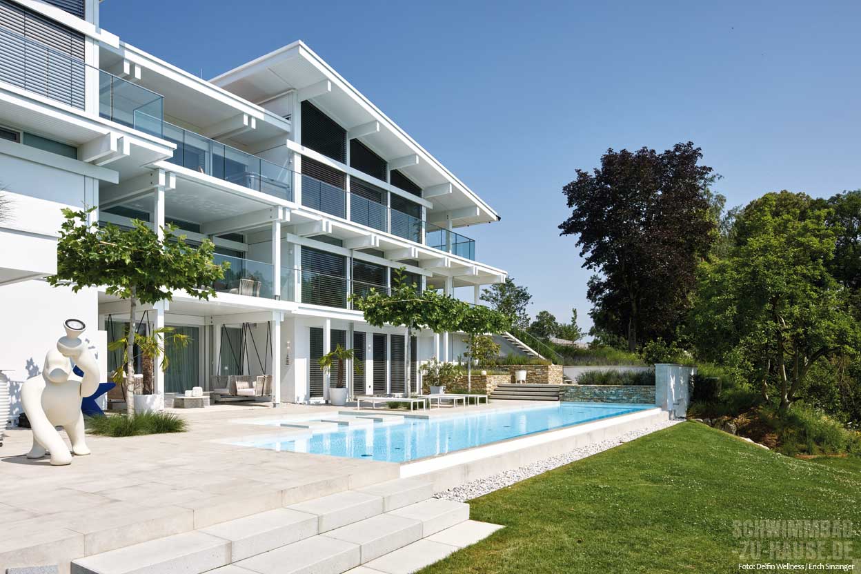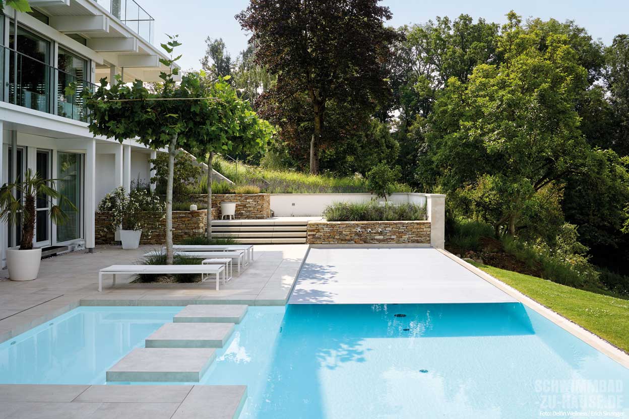 In der idyllischen Landschaft Oberösterreichs hat sich eine Familie mit diesem luxuriösen Pool ein Wellnessreich geschaffen, das kreative Ideen mit moderner Technik vereint. Das imposante Wohngebäude, die großzügige, mit viel Liebe zum Detail gestaltete Terrasse und der 15 Meter lange Pool in Hanglage mit einem angrenzenden Flachwasserbereich ergänzen sich zu einem harmonischen Ensemble.