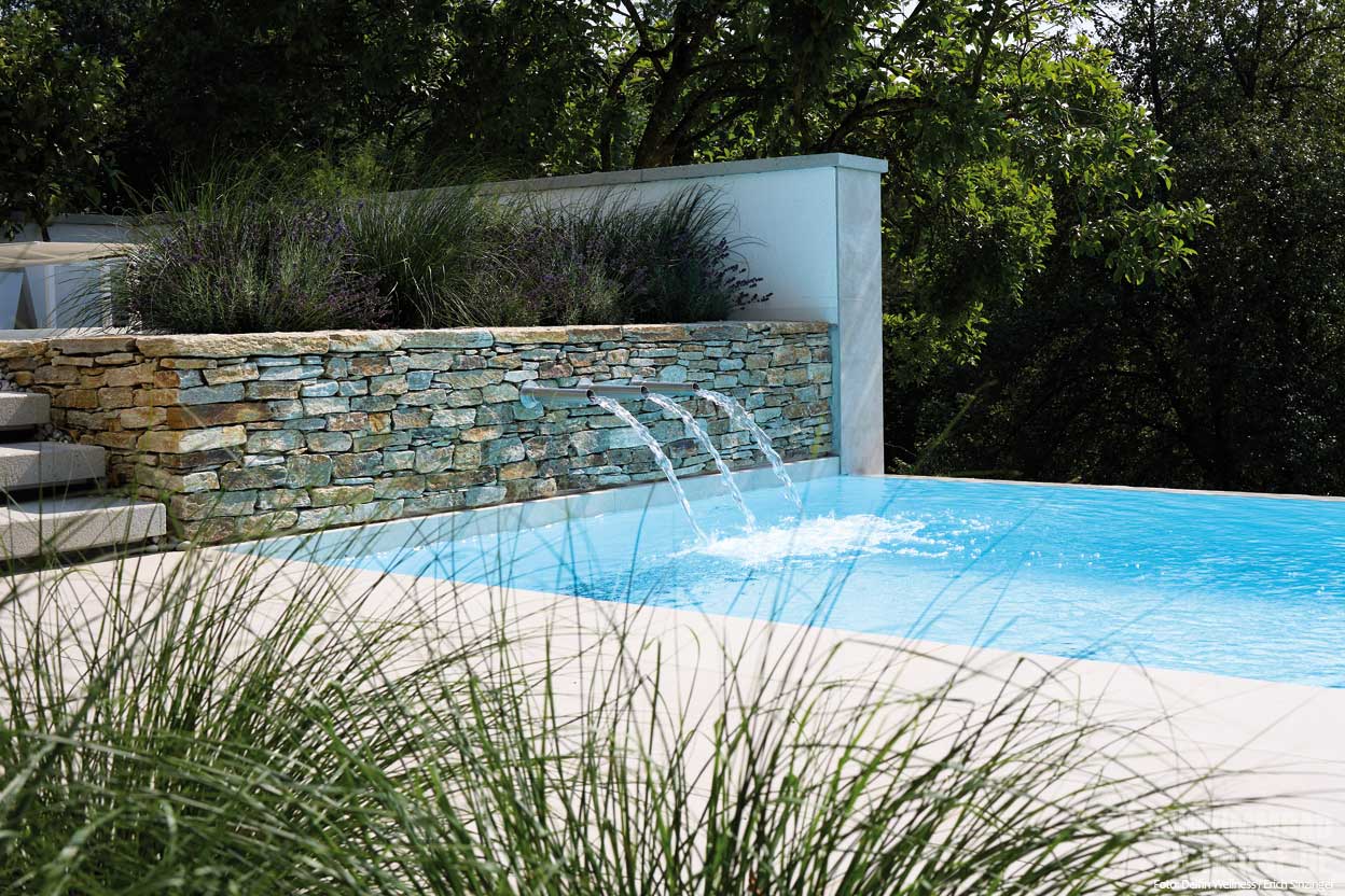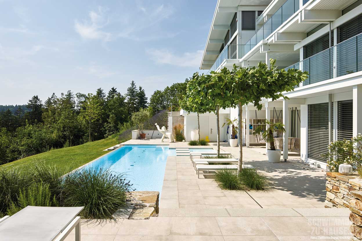 Mit Superlativen sollte man ja eigentlich vorsichtig sein, denn jede Poolanlage für sich ist einzigartig und ein Ergebnis der Wünsche und Sehnsüchte ihrer Erbauer: Ruhe und Erholung finden, etwas für die eigene Fitness tun, Erfrischung an heißen Sommertagen, Quality-Time mit Freunden und Familie verbringen oder einfach nur in der Sonne relaxen und dabei den Blick aufs Wasser genießen. Kreative Ideen durch den Gartenplaner, der hier als Generalunternehmer fungierte, und eine Gesamtgestaltung, die zur Architektur des Anwesens passt und die Hanglage optimal nutzt, machen diese luxuriöse Badelandschaft im Zentralraum von Oberösterreich jedoch zu etwas ganz Besonderem. Rund zwei Jahre dauerte die Planungsphase.