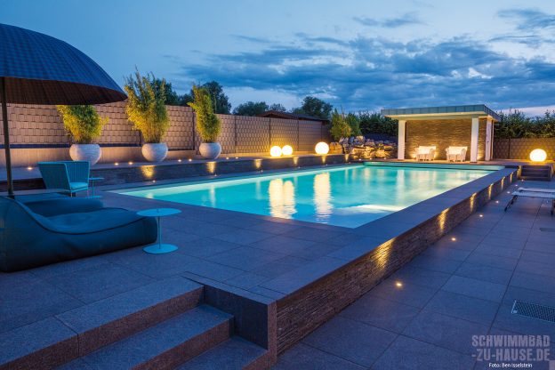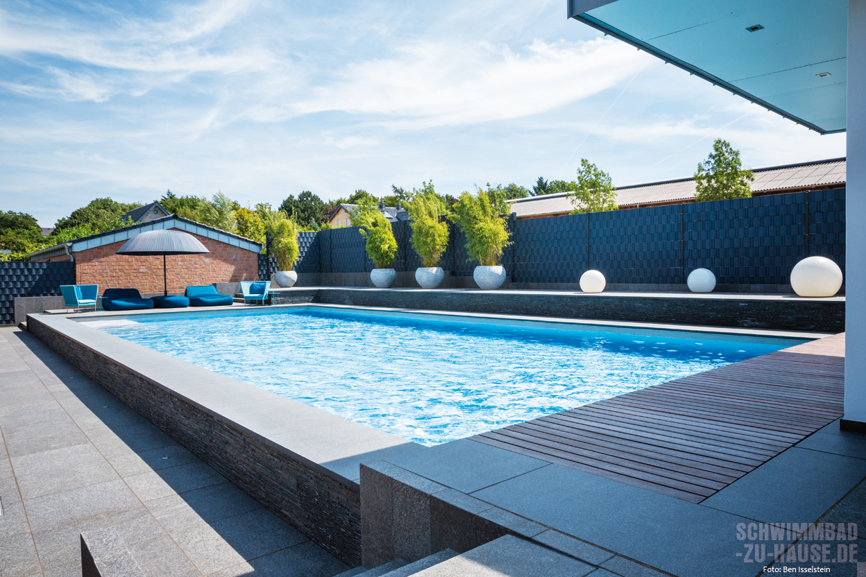 Wer sich gerne inspirieren lässt und bereit ist, von der Idee bis zur Umsetzung den Weg entschlossen zu beschreiten, der wird am Ende mit einem Verwandlungsergebnis belohnt, das Exklusi-vität für sich beanspruchen kann. Bei diesem Projekt begann alles mit einem Schwimmteich, den der Bauherr in einen konventionellen Pool umgestalten wollte, da der Teich ihm zu viel Arbeit machte und er zudem in einem Magazin seinen Traumpool entdeckt hatte.