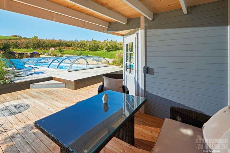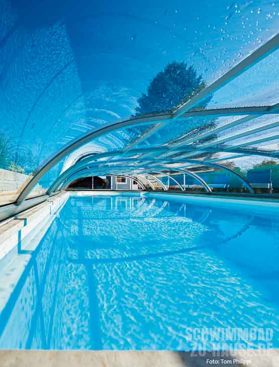 „Neben dem hohen Freizeitfaktor und der wundervollen Optik unseres neuen Pools sind wir über den geringen Arbeitsaufwand mehr als erfreut“, schwärmt die Bauherrin. „Weder ich noch mein Mann haben es für möglich gehalten, dass die verbaute Schwimmbadtechnik uns so viel Arbeit abnimmt.“ Lediglich die Überdachung sowie die Rinnen müssen von Zeit zu Zeit gereinigt werden. Die Wasserhygiene hingegen übernimmt eine vollautomatische Mess- und Regelanlage, deren einzelne Komponenten – Filteranlage „Topras Top 20“, Dosieranlage „Topras Topmatic“ und Poolsteuerung „Topras Control“ – fein aufeinander abgestimmt sind. So bleibt den Bauherren mehr Zeit, die neue Wellnessoase samt Pool in vollen Zügen zu genießen.