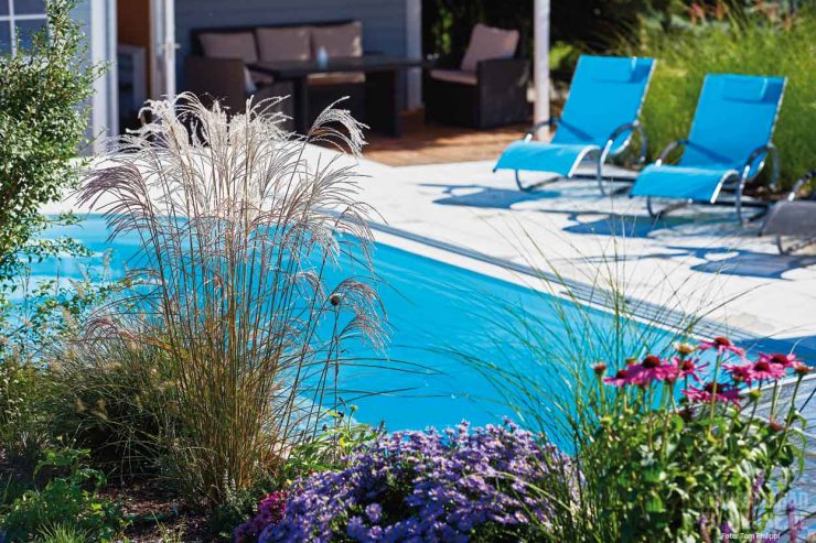 Erholung und Entspannung daheim waren hierbei die wichtigsten Aspekte, die das neue Schwimmbad erfüllen sollte. „Da wir zu Hause arbeiten, wünschten wir uns eine Ruheoase, in der wir in den Pausen neue Energie tanken können. Der Pool sollte demnach einen Ausgleich zur Arbeit schaffen“, verraten die Bauherren. In Sachen Optik und Gestaltung vertraute das Ehepaar auf die Fähigkeiten ihres Gartendesigners von der Firma Hoffmeier Gartendesign. Bereits in der Vergangenheit hatte sich der Experte hervorragend um den großzügigen Garten der Familie gekümmert. Über eine Weiterempfehlung stand kurz danach mit der Firma Sorg Schwimmbäder auch der Poolprofi fest, der mit der Planung und Umsetzung des Pools beauftragt wurde.