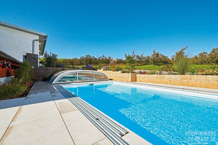 „Die Bauherren wünschten sich eine möglichst lange Badesaison“, erinnert sich Andreas Sorg. „In gemeinsamer Absprache mit dem Gartendesigner und den Bauherren entschieden wir uns daher für eine hochwertige Schwimmbadüberdachung der Firma Aquacomet.“ Während Schiebehallen noch bis vor einigen Jahren nicht gern gesehen waren, erfreuen sie sich nun großer Beliebtheit. Mit ihren ästhetischen, glasklaren Ausführungen erobern sie nach und nach den Schwimmbadmarkt. Auch die Bauherren aus dem Hegau kommen jetzt in den Genuss der Vorzüge einer Überdachung: Sie verlängert die Badesaison und minimiert gleichzeitig die Heizkosten, schützt vor Verschmutzungen des Wasser durch Blätter und Äste der angrenzenden Obstfelder und bietet auch für Haustiere sowie Kinder im geschlossenen Zustand Schutz vor dem Hereinfallen.