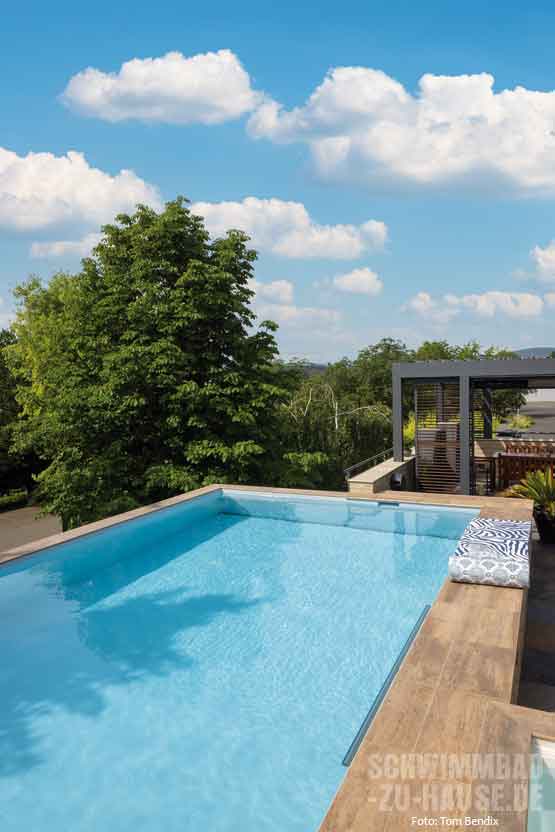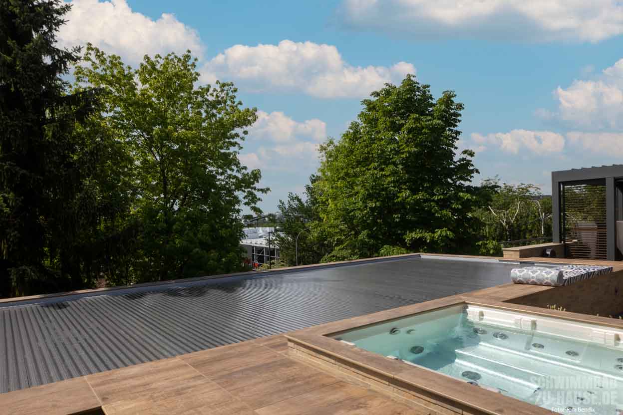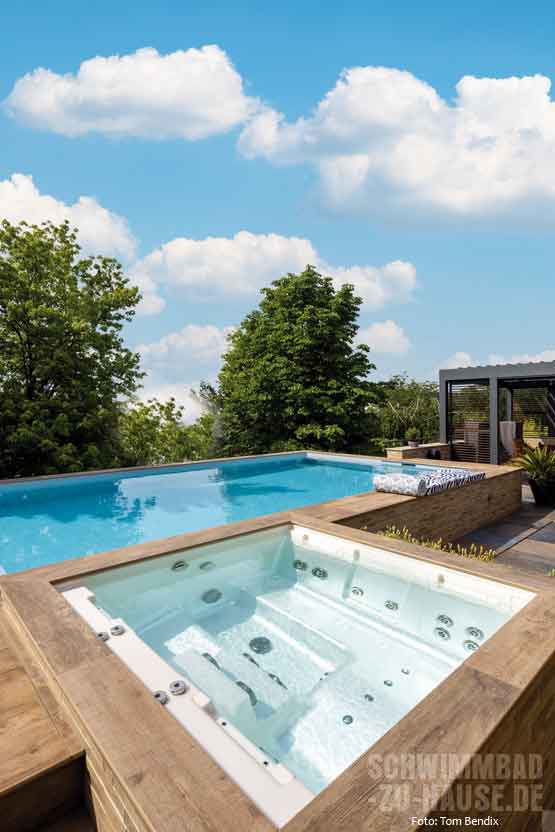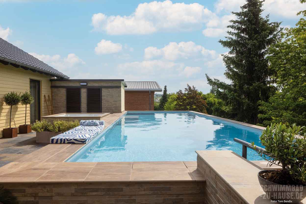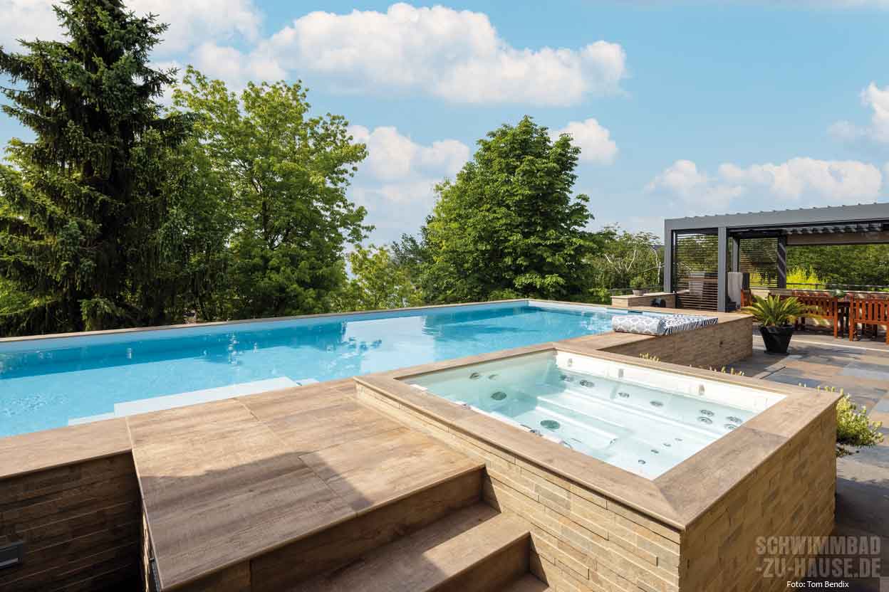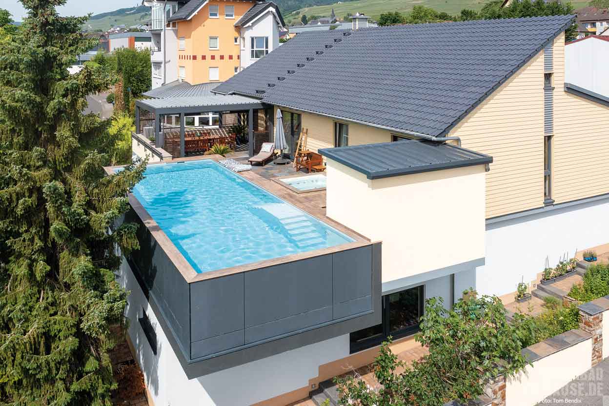 Dieses Poolprojekt punktet neben einer modernen Formensprache, dem Einsatz natürlicher Materialien und einer perfekten Kombination aus Schwimmbecken und Whirlpool vor allen Dingen mit seiner außergewöhnlichen Lage: auf der Terrasse im ersten Stock! Von hier aus hat der Bauherr beim sportlichen Schwimmen oder entspannten Whirlen alles bestens im Blick.