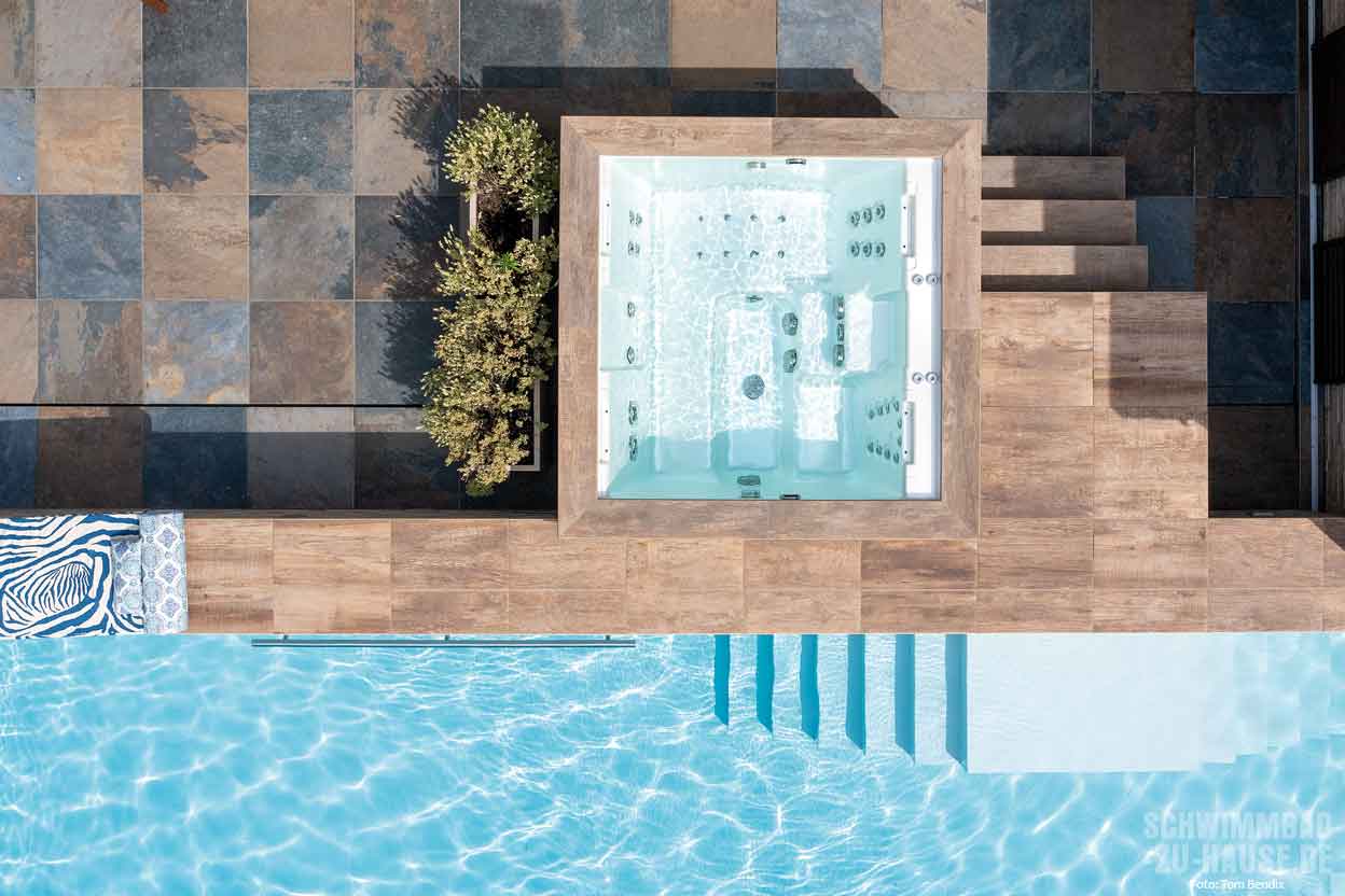 Mittig an der Längsseite des rechteckigen Schwimmbeckens von Vario Pool System mit den Maßen 11,60 x 4,40 x 1,38 Meter, das nur zu Teilen in die Terrasse eingelassen worden ist, positionierten die Poolprofis den quadratischen Whirlpool „Antigua FG4“ mit vier Massageplätzen. Eine direkt angrenzende Treppenanlage führt sowohl hoch zum Schwimmbecken als auch zum Whirlpool. „Besonderen Wert legte die Familie auf hochwertige Qualität und ästhetische Optik“, erklärt Asan weiter. Die Außenverkleidung des Beckens ist daher aus Holz und harmoniert so farblich mit den Terrassenfliesen und der Beckenumrandung, die sich ebenfalls in warmen Naturtönen präsentieren.