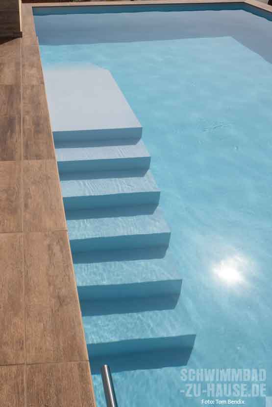 Dass die Realisierung eines Poolprojekts im ersten Stock absolute Maßarbeit und fachliches Know-how erfordert, ist selbstverständlich. Und so beauftragten die Bauherren für die Planung und Umsetzung die Firma SSF Pools by Klafs. „Die Familie wünschte sich eine Kombination aus Schwimmbecken und Whirlpool, um den Aspekten Sport und Regeneration gleichermaßen Rechnung zu tragen“, erinnert sich Schwimmbadbauer Afshin Asan im Gespräch mit haus+wellness*. Da die Grundfläche durch die Größe der Terrasse vorgegeben war und sich die Bauherrin ein harmonisches Konglomerat aus Pool und Whirlpool vorstellte, das zum einen optisch miteinander harmoniert und zum anderen die Nutzung beider Becken erleichtert, entwickelte das Team von SSF Pools by Klafs eine clevere Lösung. Pool, Whirlpool und Treppe sollten eine Einheit bilden.