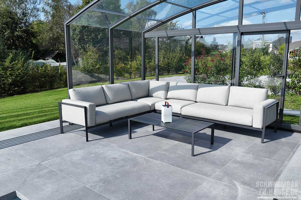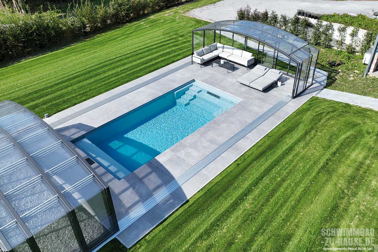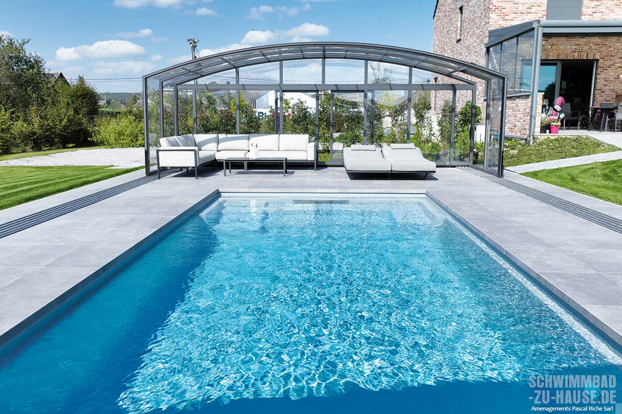 Ein durchdachtes Extra: Die Überdachung reicht über den Beckenrand hinaus. Eine verlängerte Schiene schafft zusätzlichen Raum, der sich ideal für eine Liegefläche, eine kleine Spielecke oder einfach als ruhiger Rückzugsort eignet.