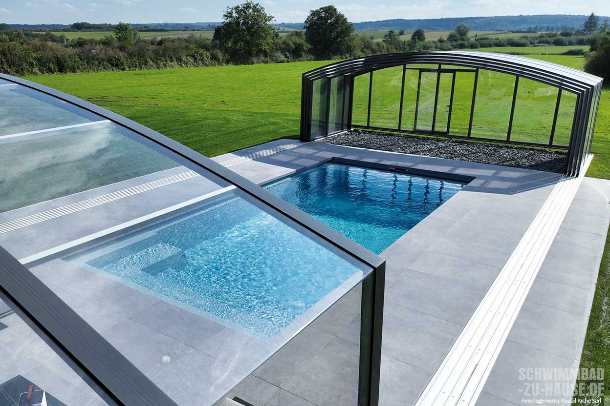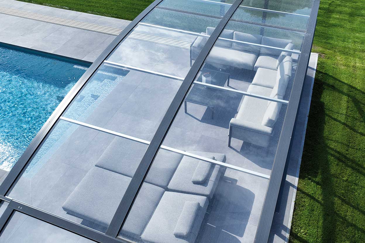 Die Aluminiumprofile in dezentem Anthrazit fügen sich harmonisch ins Gesamtbild. Das größte Element ist fest mit der Stirnwand verbunden und über eine breite Doppelschiebetür zugänglich. Die übrigen vier Segmente lassen sich in beide Richtungen verschieben und bei Bedarf teleskopartig hinter dem Becken parken. Geführt werden sie über besonders flache Komfortschienen, die eine leichte Handhabung und gleichzeitig eine dauerhafte Sturmsicherung gewährleisten – ganz gleich, ob offen oder geschlossen. So bleibt das System sicher und flexibel nutzbar.