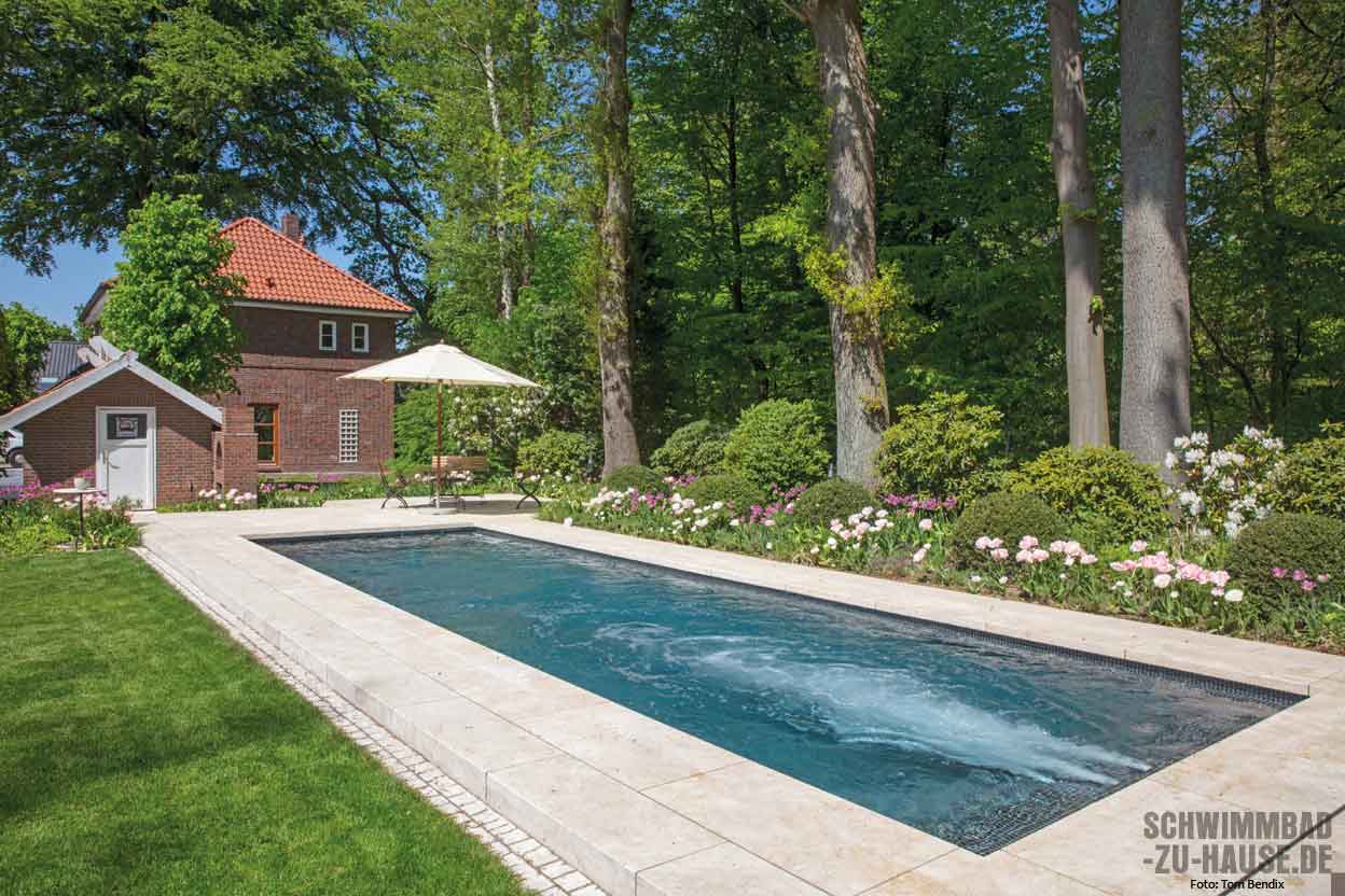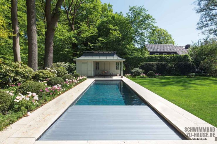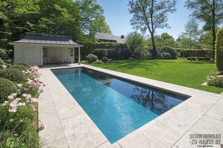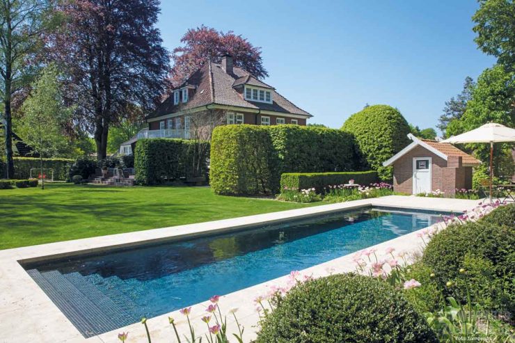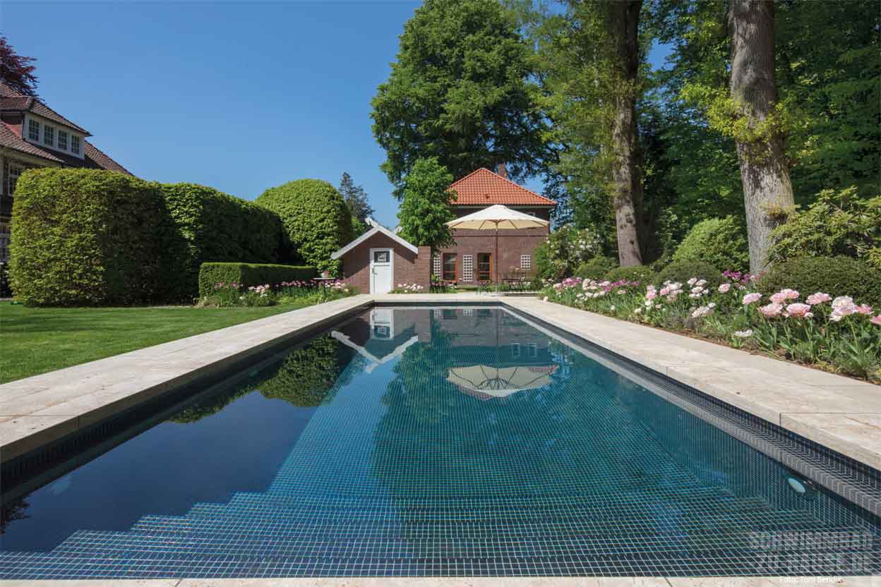 Eine leichte Sommerbrise lässt die Blumen tanzen, das üppige Grün des Rasens verströmt eine beruhigende Atmosphäre und auf der glatten Wasseroberfläche des mit Mosaiken ausgestatteten Outdoorbeckens tanzen feine Reflexionen der malerischen Umgebung … hier, in diesem traumhaft gestalteten Garten in Hamburg, lässt es sich wahrlich leben! Maßgeblich verantwortlich für dieses einmalige Wellnessfeeling ist ohne Frage der 12 x 3,50 x 1,50 Meter große Pool, der sich mit seiner rechteckigen Form harmonisch in die an einen Wald angrenzende Längsseite des großzügigen Grundstücks einfügt. In Ergänzung zum nahe gelegenen Poolhaus, einem geselligen Grillplatz und dem geschützten Loungebereich bietet der Garten somit alles, was Geist und Seele zur vollkommenen Entspannung brauchen.