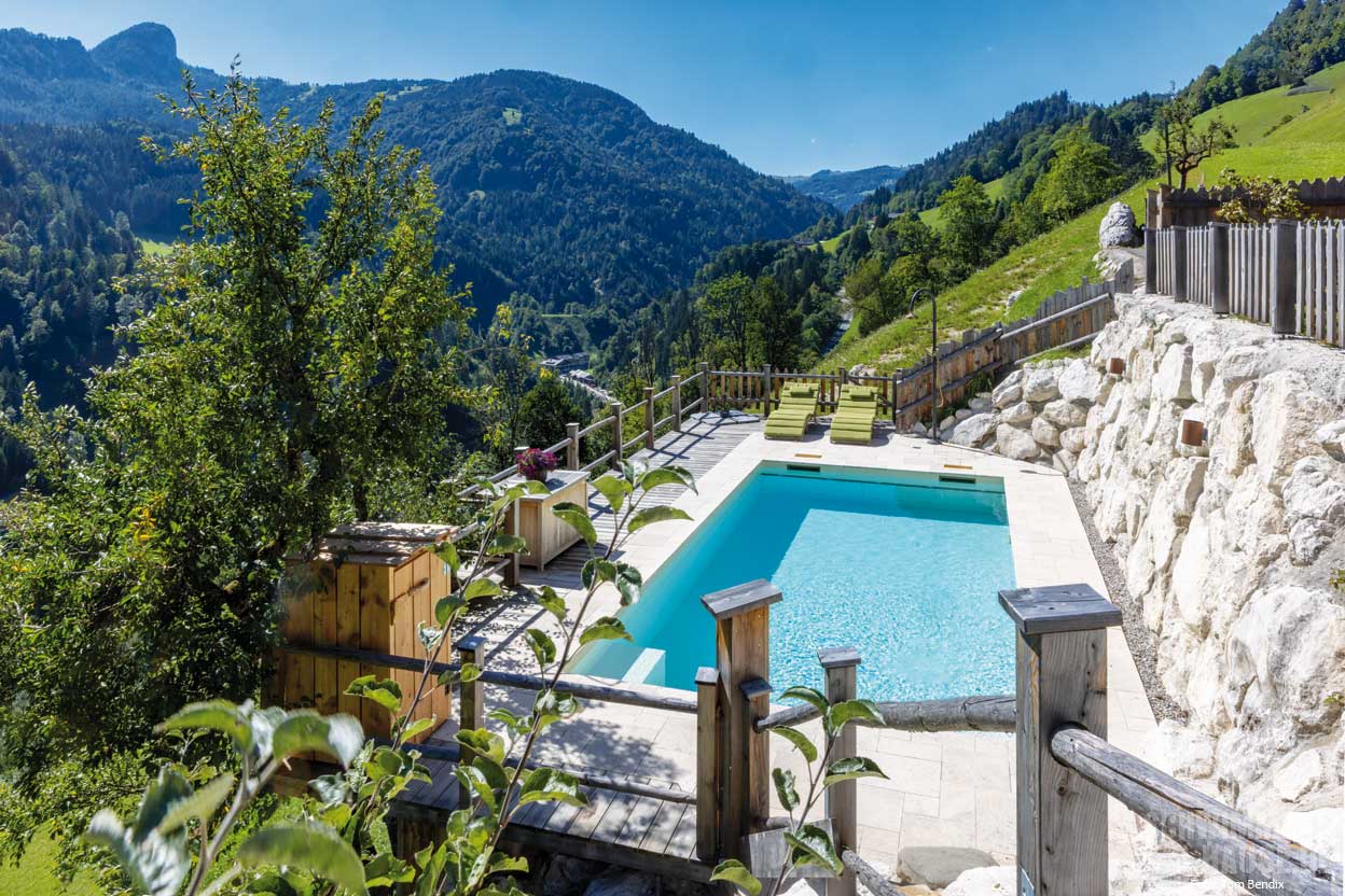 materialien“, betonen die Hofbesitzer. Und das spiegelt auch die Poolanlage wider, die zwischen einer Natursteinmauer und der hangseitigen Holzterrasse eingebettet und von einem Holzzaun umgeben ist. Eine antike Dusche und zwei Teakholzliegen unterstreichen das rustikale Flair.