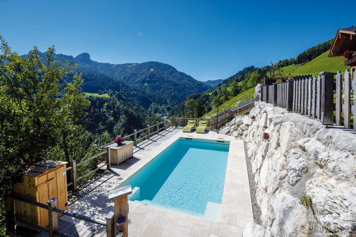 berichtet Projektleiter Roman Vitzthum. So musste das 3,5 x 7,5 Meter große KWS-Fertigbecken im Ort nochmals auf einen eigenen Sondertransporter umgeladen werden, damit die letzten Kilometer auf der engen Bergstraße bewältigt werden konnten. Die Hofbesitzer hatten das Gelände mit Natursteinschlichtungen so vorbereitet, dass die Sopra Salzburg das Becken dann mit einem Kran einbringen konnte.