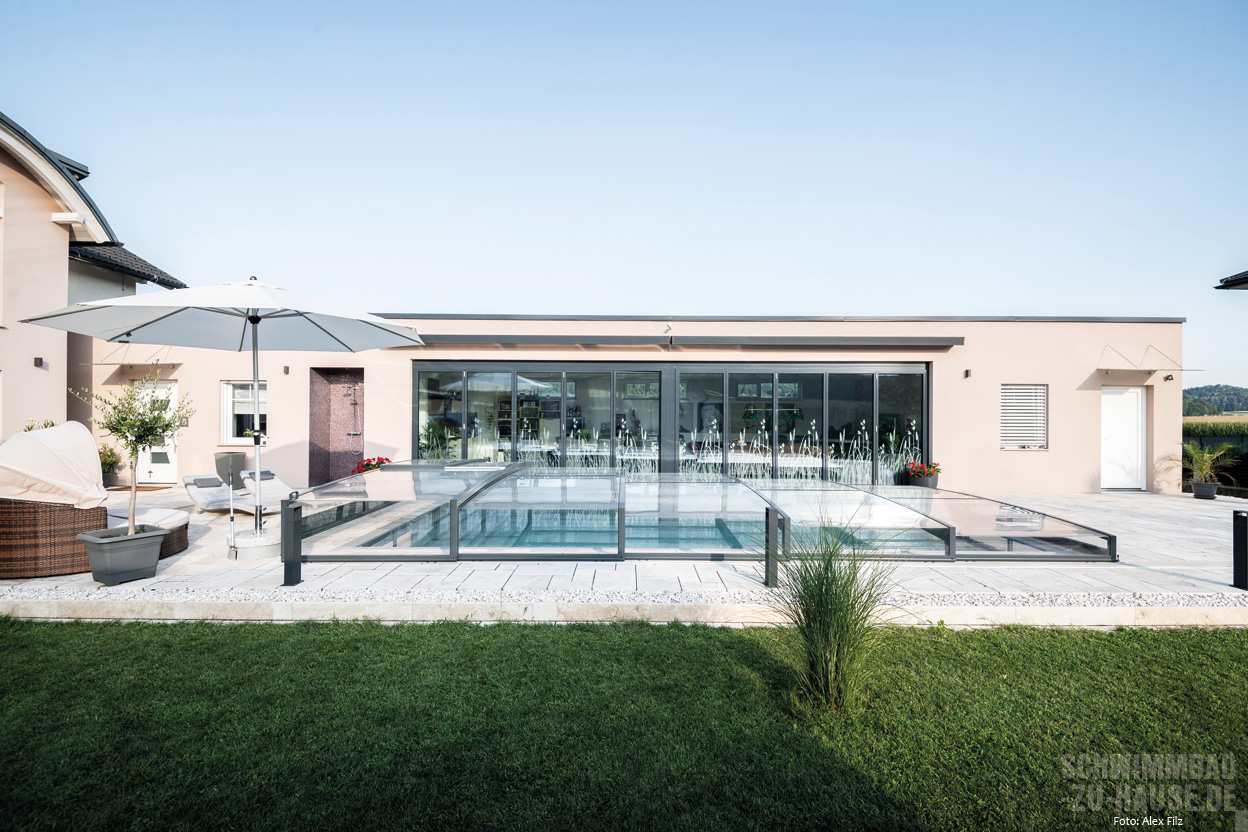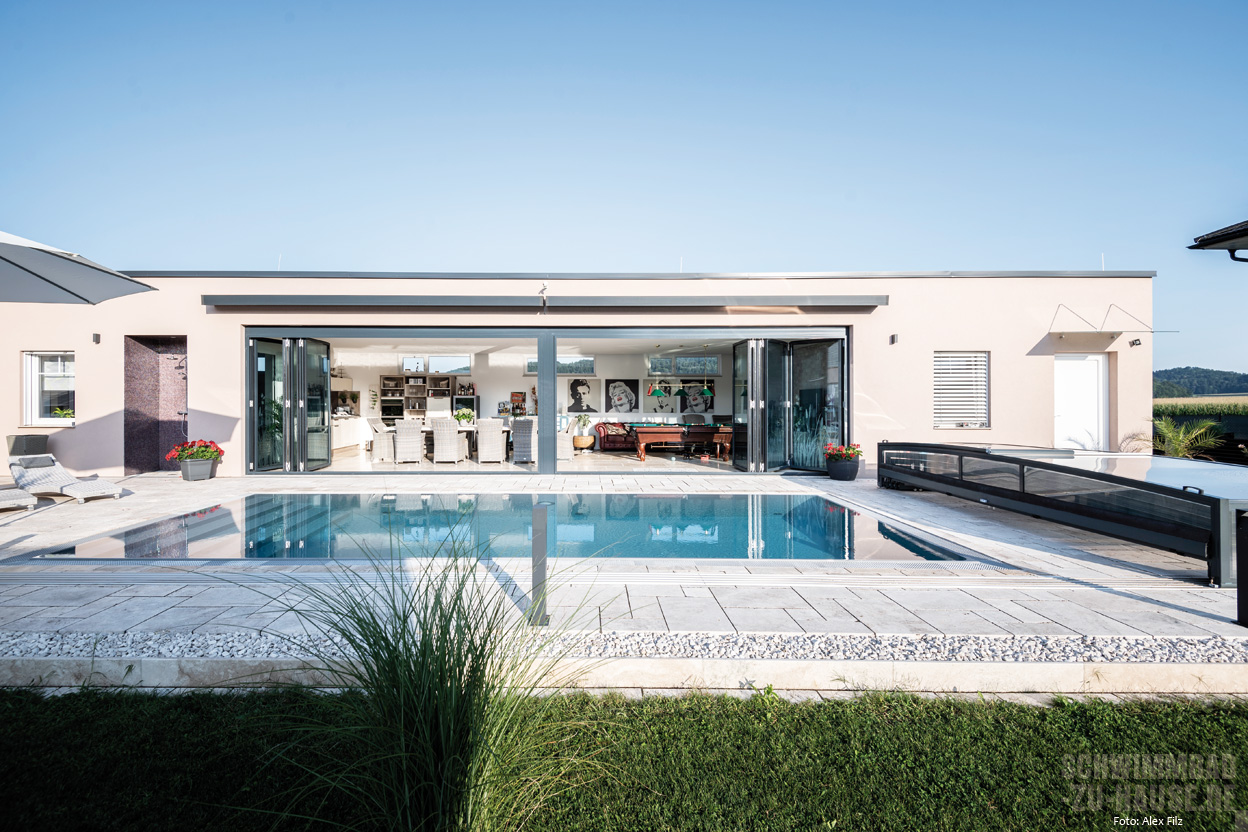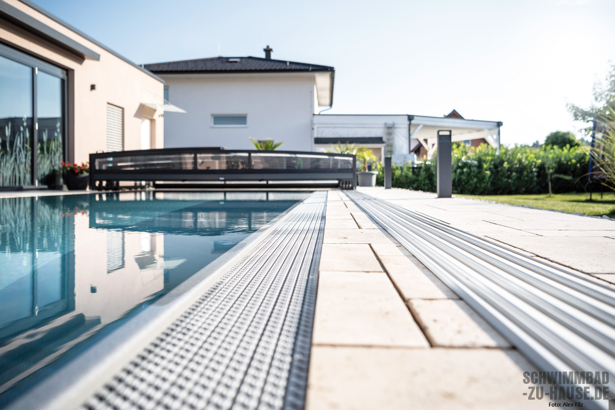 Eine Vorgabe des Bauherrn war dabei die Implementierung einer Schwimmbadüberdachung. Die Vorteile solcher Systeme liegen auf der Hand: So wird bei ausgefahrener Überdachung nicht nur Schmutz in Form von Blättern oder kleinen Ästen vom Poolwasser ferngehalten, was wiederum den Reinigungsaufwand minimiert, auch der Einsatz von chemischen Mitteln kann dadurch reduziert werden, was unter anderem Kosten spart. Bei diesem Objekt in der Steiermark wurde eine Variante mit Schienen und Gummirädern gewählt. Wer ebenfalls über den Einbau eines solchen Überdachungsmodells nachdenkt, sollte laut Poolprofi Philip Wagmeister in erster Linie darauf achten, dass der Untergrund eben ist.