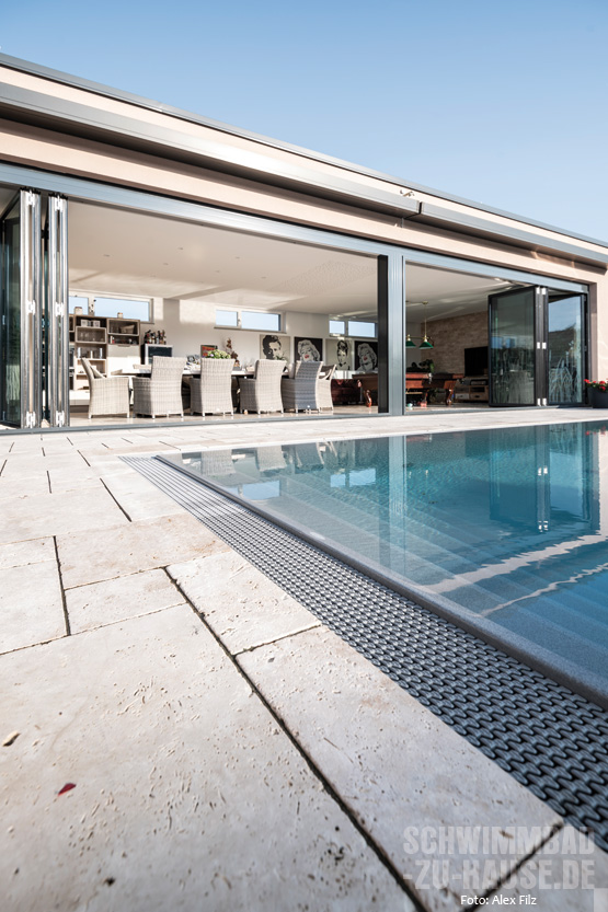 Die „relativ leichte“ Umsetzung des Projekts, wie sie der zuständige Vertriebsleiter beschreibt, ist auch darauf zurückzuführen, dass der Bauherr, abgesehen von der Überdachung, vergleichsweise wenige Anforderungen stellte und den Poolbauern somit weitestgehend freie Hand ließ. Dass die Schwimmbadunternehmen auch ohne ein vom Kunden definiertes Gestaltungskonzept einzigartige Wellnessträume verwirklichen können, zeigt auch dieses Anwesen wieder einmal eindrucksvoll.
