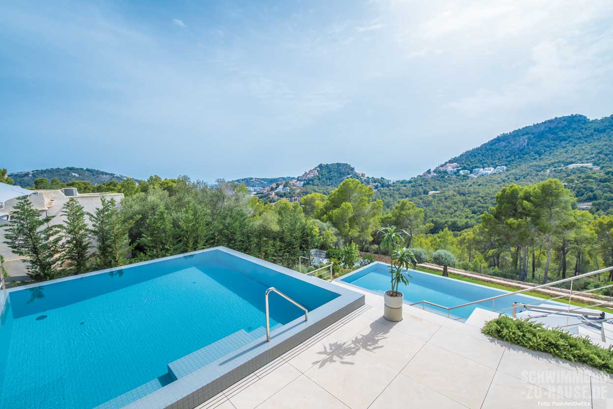 Die Auftraggeber, ein amerikanisches Paar, hatten durch ihre jahrelangen Auslandsaufenthalte und ausgedehnte Reisen genügend Input und klare Vorstellungen von ihrem neuen Wellnessreich: Gewünscht war eine geradlinige Gestaltung im typischen Mallorca-Chic auf sehr hohem Niveau. Größe und Form der Pools hatten die Immobilienbesitzer – der Bauherr ist selbst Ingenieur – vorgegeben. Gleichzeitig waren sie aber offen für Details beim Design und in der Ausführung.