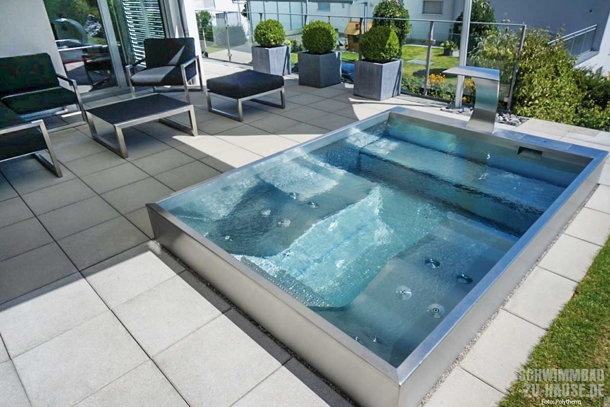 Auch in der Gestaltung zeigen sich Mini-Pools vielseitig. Ob puristisch aus Edelstahl, mit Naturstein verkleidet oder als stilvolles Design-objekt: Sie lassen sich harmonisch ins Gesamtbild einfügen. Ein bodenbündiger Einbau schafft fließende Übergänge zur Terrasse. LED-Leuchten setzen stimmungsvolle Akzente und machen das Wasser abends zum lebendigen Blickfang. Viele Modelle verfügen zudem über integrierte Sitzbänke oder Liegezonen, die perfekt sind für entspannte Stunden im warmen Wasser.