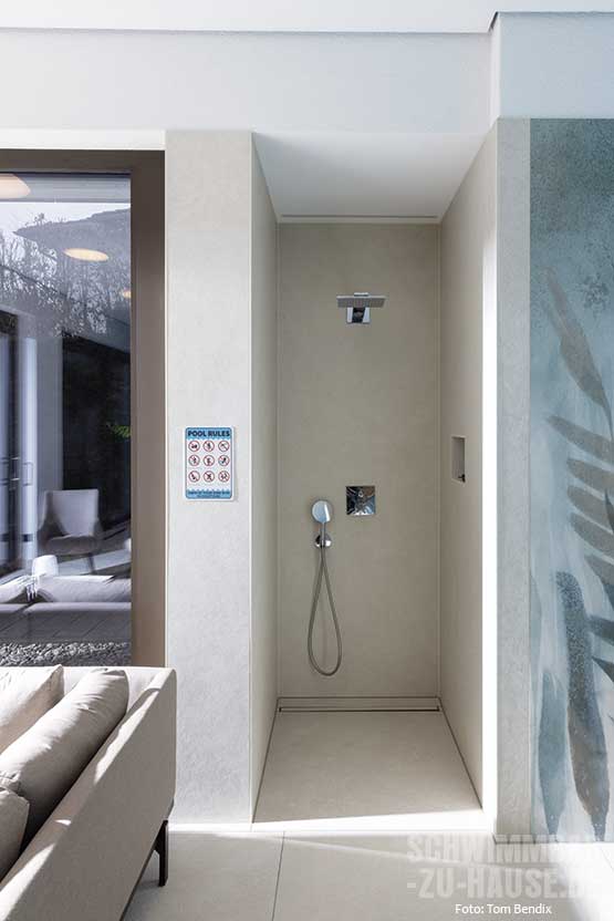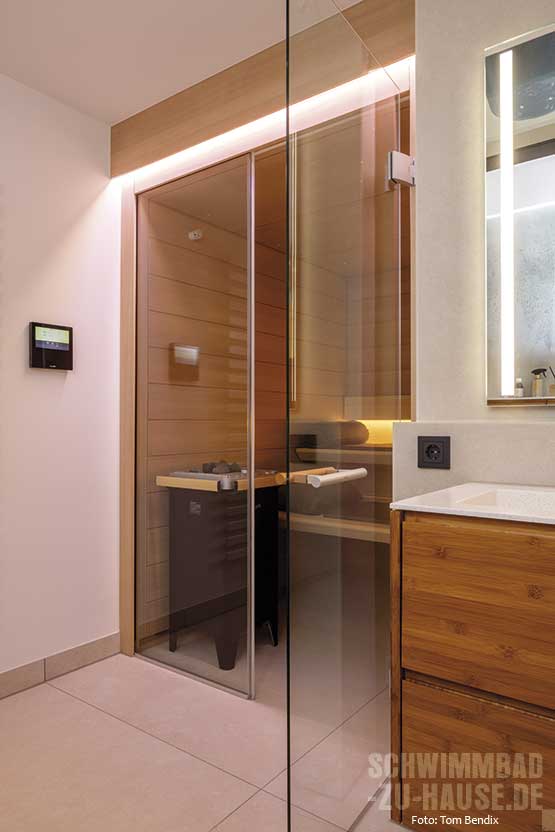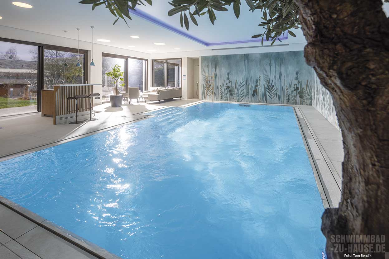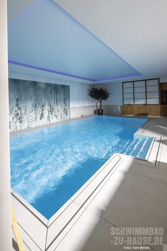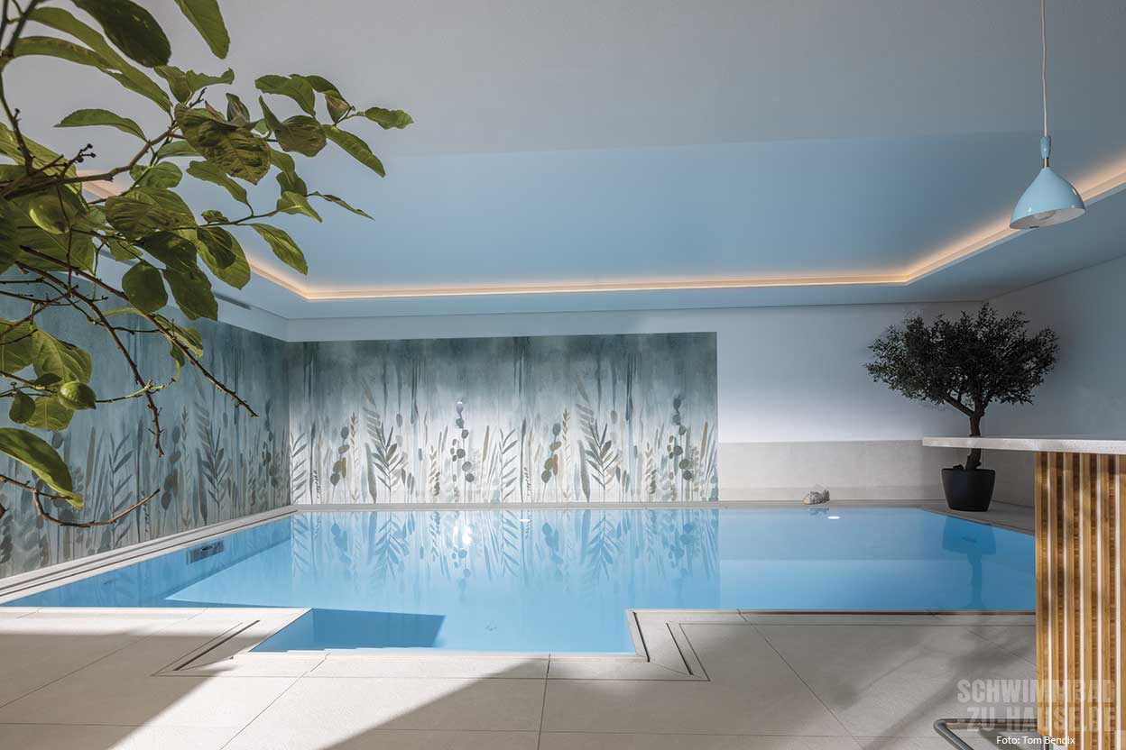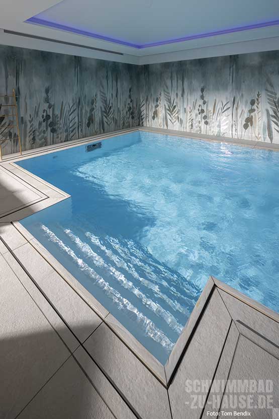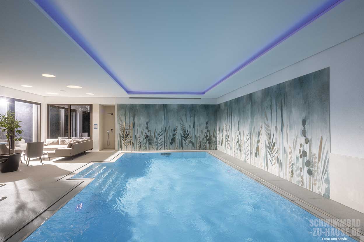Als Einstieg in den 9 x 4,50 Meter großen Pool dient eine außen liegende Treppe an der Längsseite, die vor der großen Fensterfront ins Wasser führt. Das in hochwertiger Sandwichbauweise mit einem speziellen Waben-Verbundsystem gefertigte Sopra-Becken ist vollflächig isoliert, formstabil und zeichnet sich durch seine angenehme, aber gleichzeitig äußerst resistente Oberfläche aus. Die Überlaufrinne aus Naturstein schafft einen harmonischen Übergang zur Poolumgebung. Hier sorgen imposante Kübelpflanzen sowie die dekorative Wandgestaltung, die an einen Dschungel erinnert, für exotisches Flair. Die indirekte Deckenbeleuchtung mit Farbwechsel setzt den Pool eindrucksvoll in Szene und schafft eine stimmungsvolle Atmosphäre.