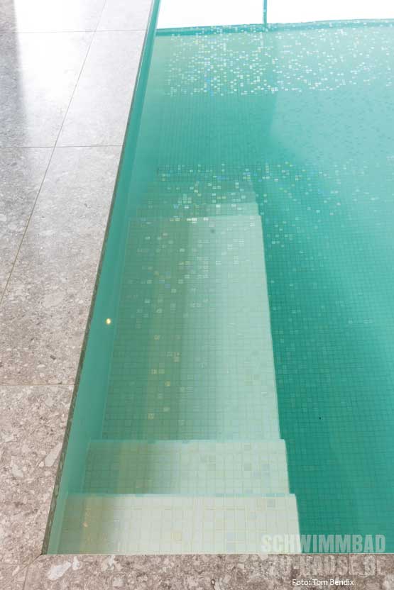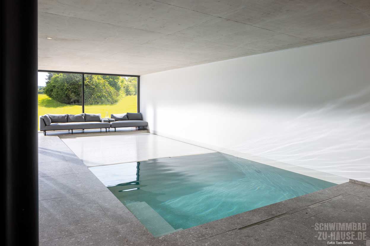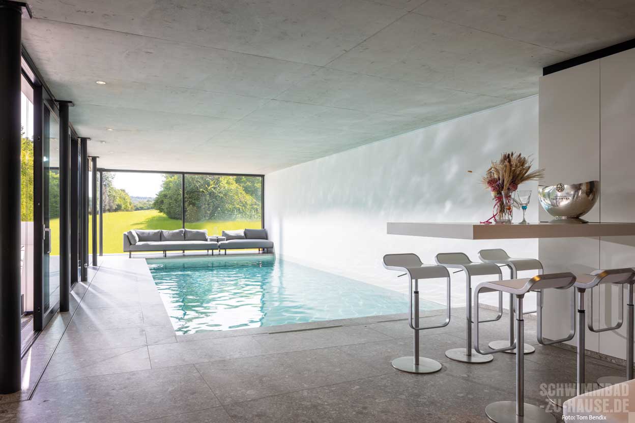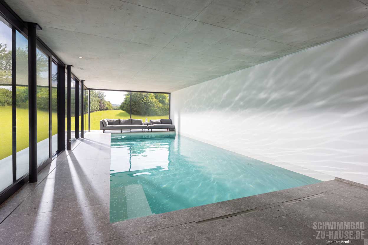 Bereits beim Betreten des Raumes zieht die lichtdurchflutete Atmosphäre die Aufmerksamkeit auf sich. Großformatige Fensterfronten an zwei Seiten lassen das Tageslicht auf der Wasseroberfläche tanzen und schaffen ein freundliches Ambiente. Der Blick fällt sofort auf das 8,50 x 3,80 Meter große Betonbecken, das mit feinen Mosaikfliesen in schlichter Farbgebung gestaltet wurde. Diese lassen das Wasser frisch und einladend erstrahlen. Die klare Linienführung der Poolumrandung aus großformatigen Fliesen vermittelt dabei eine zeitlose Eleganz.