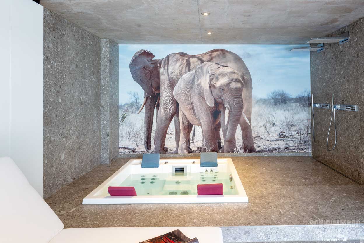 Elefanten geschmückt ist – eine künstlerische Note, die den Raum zusätzlich aufwertet. Der Whirlpool bietet mit seinen Hydromassagedüsen die perfekte Möglichkeit, Muskeln zu lockern und vollständig zu entspannen.