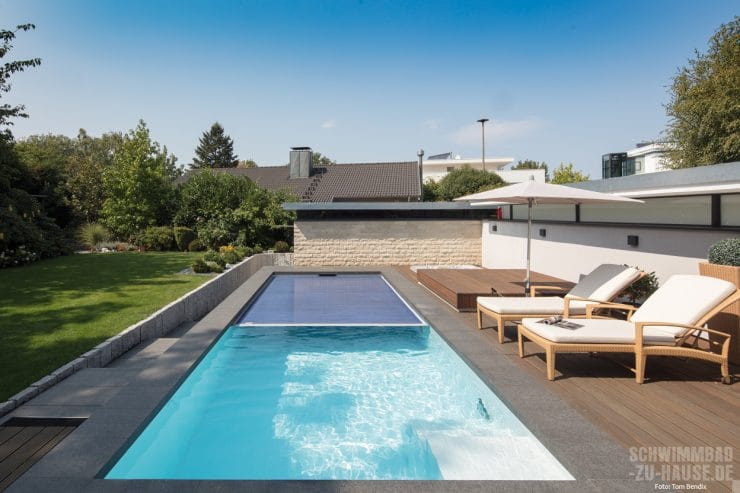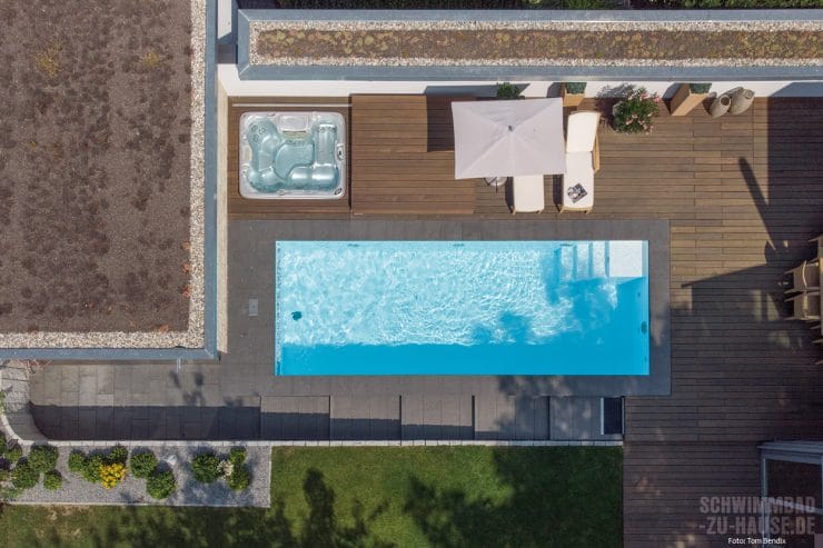 Jetzt aber von vorne: Obwohl das Grundstück hinter dem Wohnhaus recht knapp bemessen ist, wünschten sich die Bauherren hier ein modernes Schwimmbecken, das gleichsam für Sport und Erholung sorgt. Daher wurde ein kompakter Pool vom zuständigen Architekten Herrn Langendorf