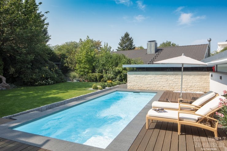 „Wenn der Platz im Garten und damit der Platz für den Pool begrenzt ist, ist Maßarbeit gefragt“, verrät Steffen Henne, zuständiger Schwimmbadbauer im exklusiven Gespräch mit haus+wellness*. Das Polystone-Becken mit integriertem Rollladenschacht war nahezu prädestiniert für das Grundstück der Bauherren. Es fügt sich exakt seitlich in den Garten ein und bildet so eine Verlängerung der Sonnenterrasse hinter dem Haus. Da die Bauherren sich ein geradliniges Design mit hochwertiger und zeitloser Optik wünschten, fassten die Fachleute das Becken mit einer edlen Umrandung aus großformatigen Natursteinen ein. Diese bildet einen spannenden Kontrast zum hellen rechteckigen Becken.