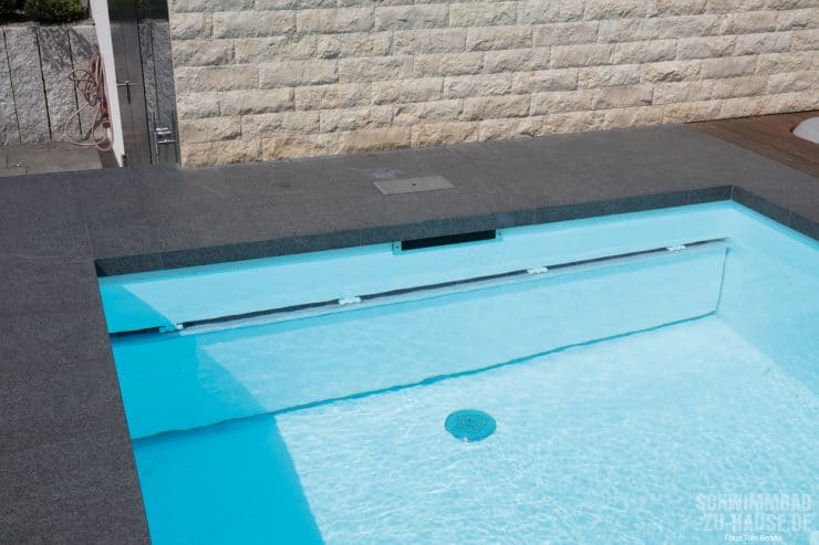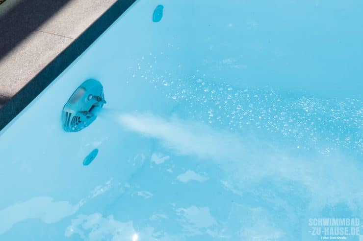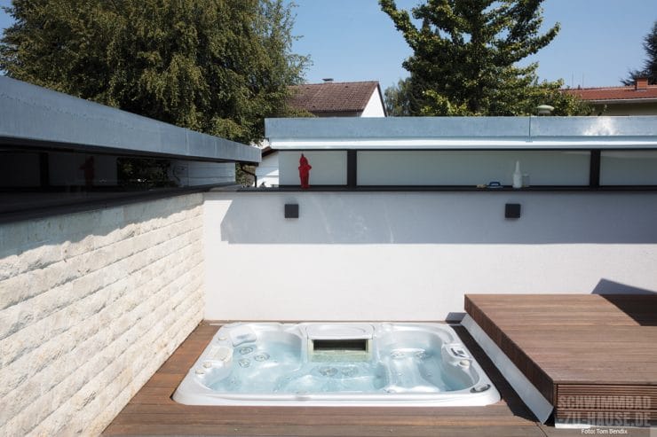 Auch technisch hat es dieses Poolprojekt in sich. Neben einer leistungsstarken Gegenstromanlage, die das Schwimmen auf kleinem Raum ermöglicht, entschied man sich bei der Wasseraufbereitung für ein ausgeklügeltes System aus Sandfilteranlage mit Pumpen, Filtersteuerung sowie Mess-, Regel- und Dosiertechnik. Maximaler Komfort und minimaler Arbeitsaufwand sind somit garantiert. Aufgrund der räumlichen Vorgaben war dies eine Herausforderung für Steffen Henne. „Wir mussten einen unterirdischen Technikschacht unter der Treppe des Whirlpools kreieren, damit man ohne Probleme an die Technik des portable Spas kommt und gleichzeitig Platz für die Attraktionstechnik des Beckens hat. Zugleich durfte die Statik des Pools und die des Holzschiebedecks nicht gefährdet werden“, erinnert sich der Fachmann. Mit Geschick und professionellen Know-how meisterte man diese Aufgabe. Das Ergebnis übertraf alle Wünsche der Bauherren. „Die Entscheidung für einen eigenen Pool war eine der besten, die wir je getroffen haben“, verraten die zufriedenen Bauherren abschließend.
