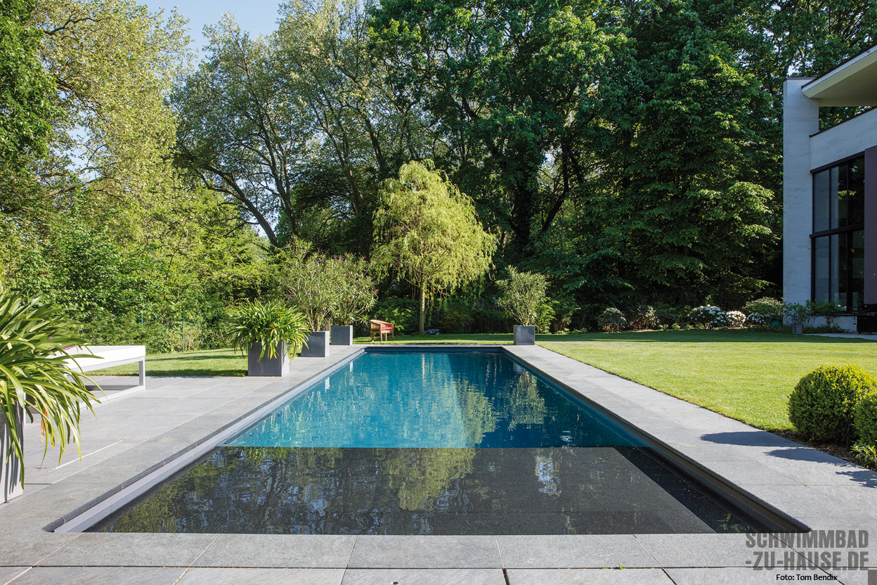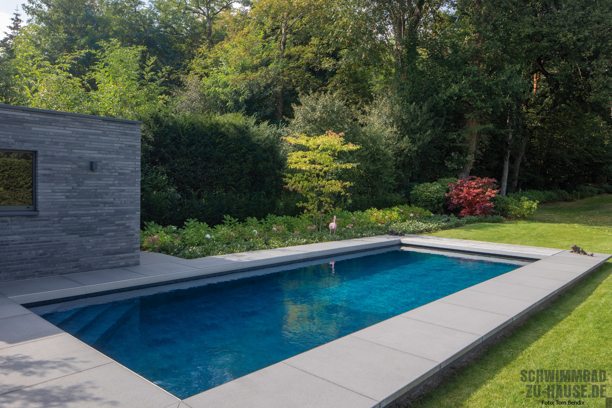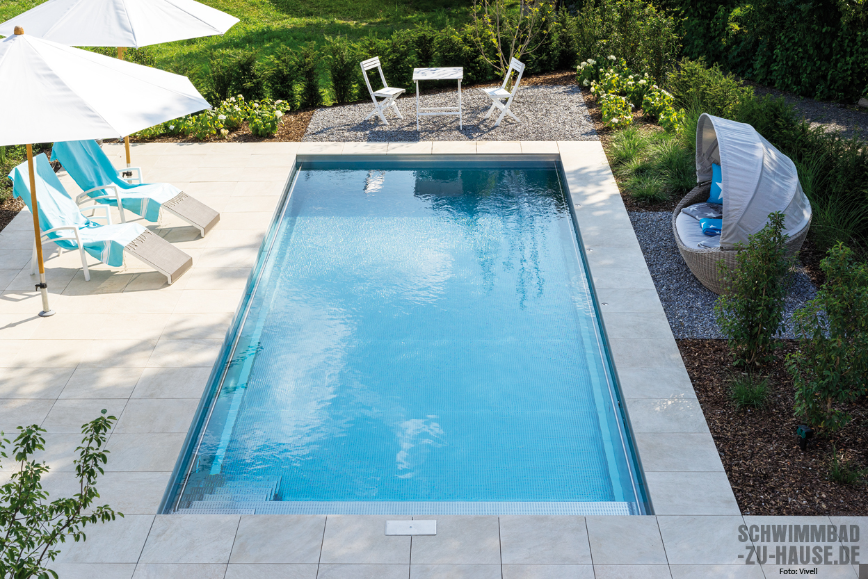 Das herkömmlichste Material für die Verwirklichung eines Swimmingpools ist Beton. Bereits seit vielen Jahrzehnten wird dieser klassische Werkstoff benutzt, der besonders mit seiner Flexibilität, was Form und Größe des Beckens betrifft, punkten kann. Eine besondere Rolle hat bei Schwimmbadprojekten dabei der Sichtbeton. Im Gegensatz zu anderen Betonpools zeichnen sich solche aus Sichtbeton dadurch aus, dass keine zusätzlichen Abdichtungsmaßnahmen wie das Verbauen von Fliesen oder – heutzutage eher üblich – einer Schwimmbadfolie ergriffen werden. Viele Bauherren schätzen hierbei die puristische Optik des Betons, dennoch muss bei dieser Variante auch einiges beachtet werden. So ist der Werkstoff lediglich wasserundurchlässig: Auf übermäßige Ausschmückungen wie etwa Wandvorsprünge oder Vertiefungen sollte also verzichtet werden, um möglichen Rissen vorzubeugen.