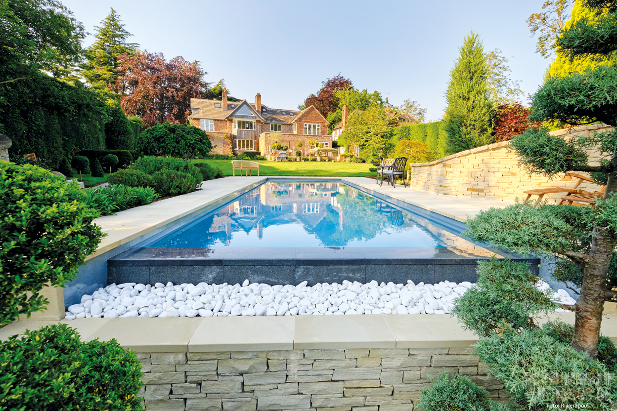 Dabei fängt das Thema Individualität schon deutlich früher an, nämlich bei der Wahl des Materials für das Becken sowie der Beckenhydraulik. Bei letzterem unterscheidet man zwischen einem Skimmer und einer sogenannten Überlaufrinne. Skimmer sind dabei die traditionellere Variante, bei der sich der Wasserspiegel zwischen 10 und 15 Zentimeter unter dem Beckenrand befindet. Technisch ist diese Option leichter zu realisieren und verursacht somit für den Endkunden auch weniger Kosten.