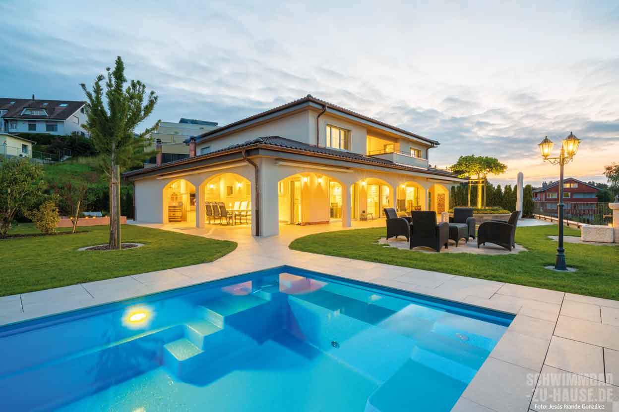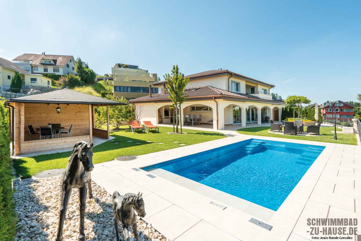 Man nehme ein großzügiges Grundstück in der Zentralschweiz, man füge ein Landhaus im mediterranen Stil hinzu und komplettiere das Ganze mit einem modernen Outdoor-Pool, der zum täglichen Baden einlädt – und fertig ist das Urlaubsdomizil für Zuhause! Wichtig war den Bauherren bei der Realisation ihrer Wellnessoase im Garten neben der Optik und der hohen Qualität des Beckens vor allem eine vollautomatische Wasseraufbereitung auf natürlicher Salzbasis sowie möglichst effiziente Unterhaltskosten.