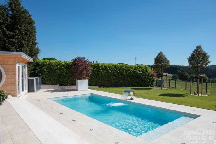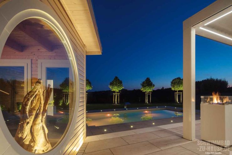 Zu Hause ist es doch immer noch am schönsten. Dies ist auch das Motto der Bauherren aus dem Bergischen Land, nachdem ihr Eigenheim ein wahrer Wellnesstempel geworden ist. Highlight der Anlage ist besonders bei Dunkelheit das großzügig beleuchtete Schwimmbecken. Die Sauna und der Whirlpool runden das Gesamtbild ab. Details wie die Gegenstromanlage, die Schwalldusche und der Außenkamin machen den Urlaub daheim perfekt.
