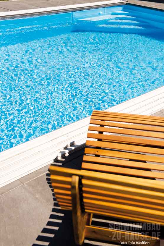 Während ein Großteil der gestalterischen Planung, der Aushub sowie Betonierung des Beckens noch in Eigenregie ausgeführt werden konnten, war bei der technischen Umsetzung des Schwimmbeckens das Know-how eines Fachmanns gefragt. Die Wahl des Bauherren fiel auf den erfahrenen Schwimmbadbauer Adolf Gerzer. Diesen kannte man bereits aus früheren Zeiten. Weiterer Pluspunkt: die regionale Nähe und die damit verbundenen kurzen Anfahrtswege, die sich vor allen Dingen in Sachen Direktberatung und beim späteren Service positiv bemerkbar machen. Dieser verrät gegenüber haus+wellness*: „Die Aufgabe gestaltete sich äußerst interessant, da die Familie bereits sehr konkrete Vorstellung hinsichtlich Gestaltung und technischer Details hatte.“ So legte man neben einer Gegenstromanlage und der Wasseraufbereitung via Salzelektrolyse besonders großen Wert auf eine zum Pool passende Überdachung. Bei der Positionierung des 10 x 4 x 1,50 Meter großen, schlicht rechteckigen Beckens wurde vor allen Dingen die ideale Sonneneinstrahlung bedacht, sodass sich der neue Pool jetzt mittig und längs im Garten hinter dem Wohnhaus präsentiert. Hierdurch ist gewährleistet, dass die Terrasse, die mittels gleichmäßig verlegter grauer Fliesen optisch mit dem Pool verbunden ist, in den heißen Stunden des Tages im Schatten liegt, während das mit Folie ausgekleidete Betonbecken in den Genuss der warmen Sonnenstrahlen kommt. Über eine dezente Treppe an der unteren Stirnseite gelangt die Familie zum Schwimmen oder Planschen sicher und bequem ins Badewasser. Trotz stattlicher Länge von zehn Meter entschied man sich für eine leistungsstarke Gegenstromanlage, die ein professionelles Schwimmtraining garantiert. Nach dem Training kann man sich dann auf den gemütlichen Liegestühlen aus Holz entspannen oder die Ruhe des Gartens auf der Terrasse genießen.